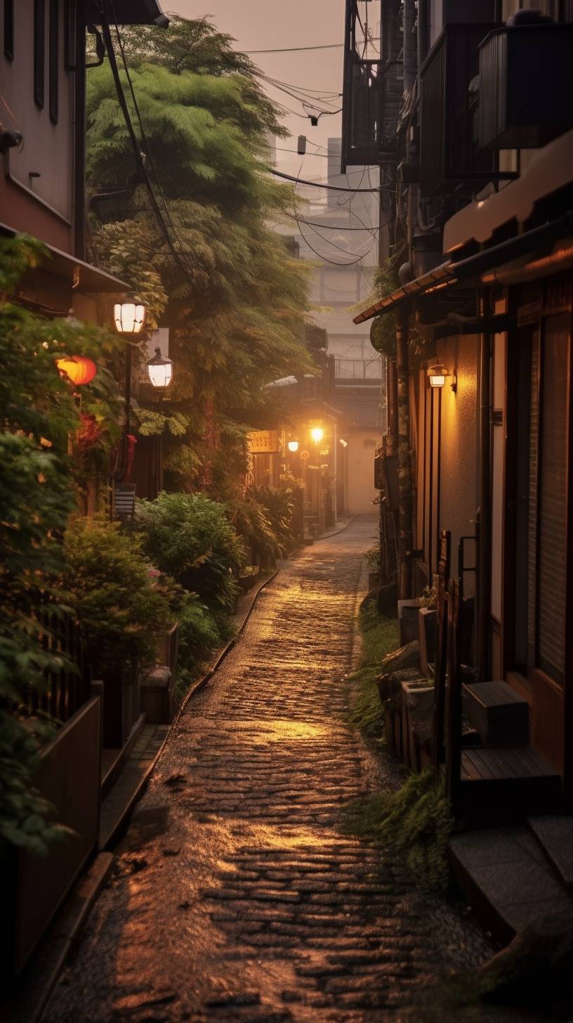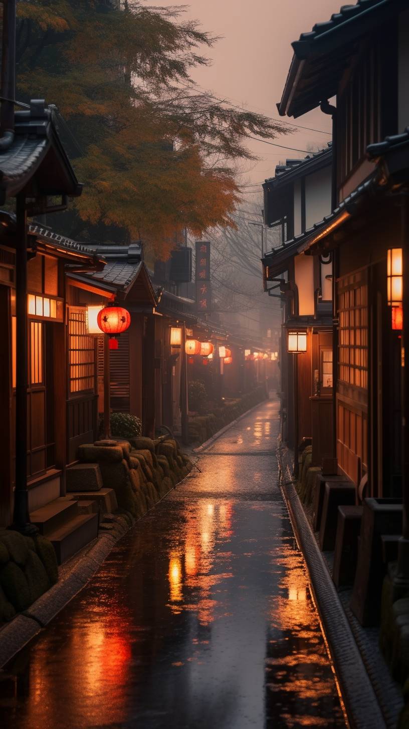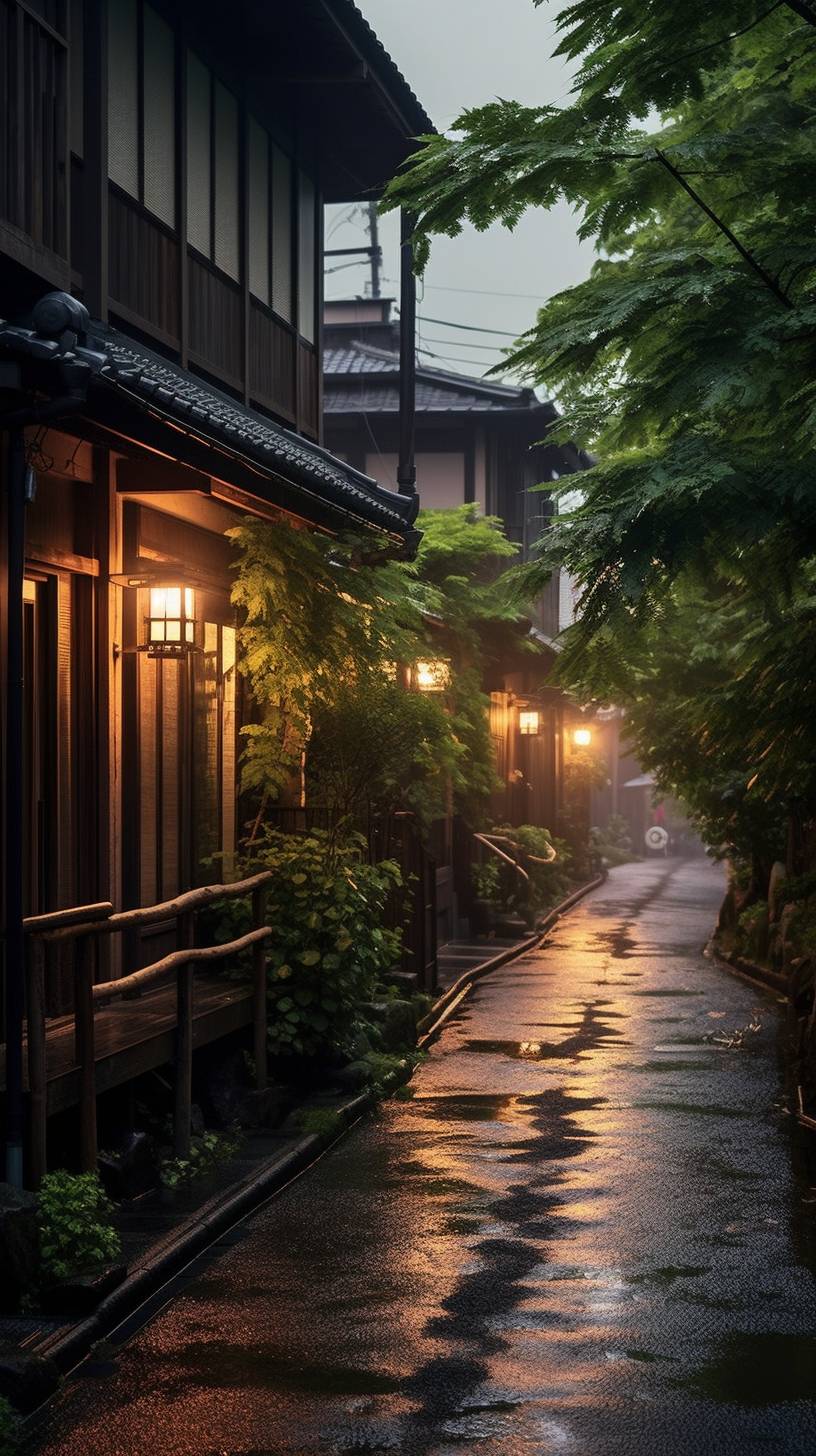 Location: In the evening, the streets of Kyoto, ancient town, Atmosphere: green and foggy, Soft and beautiful light, Equipment: canon r5, 50mm f22, Image Quality: photorealistic realistic, The photo of dawn, 2 4K, photorealistic realistic, HD, Settings: --ar 9:16 --chaos 2 --v 5.1 --style raw