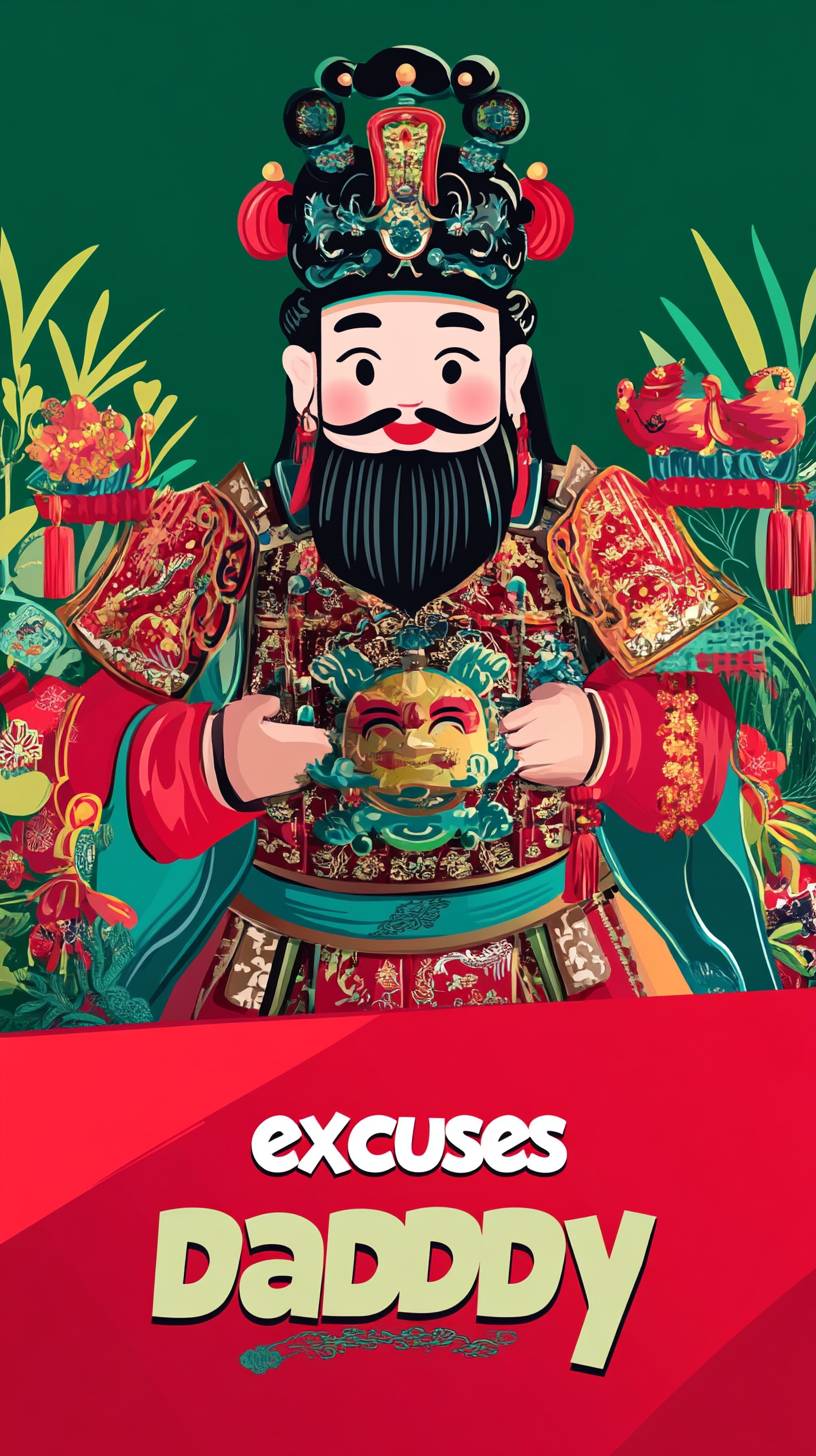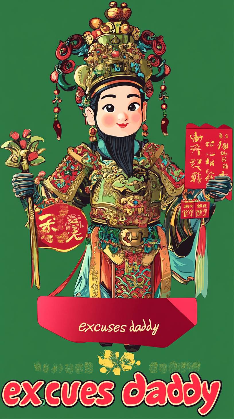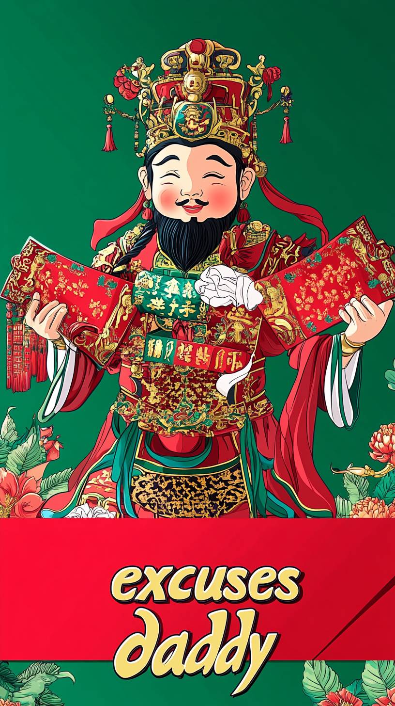 A red envelope cover featuring the Chinese God of Wealth, holding traditional Spring Festival couplets and wearing ancient armor with intricate designs. The background is green, creating an atmosphere full of festive spirit. A large " excuses daddy" text in bold font appears at center bottom. Vector style illustration. --ar 9:16 --style raw --no text
