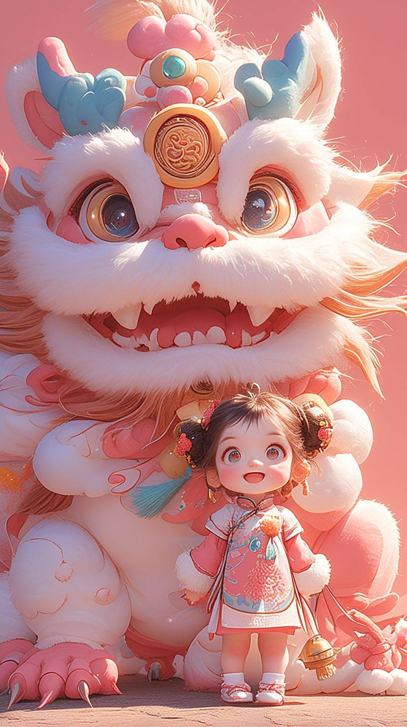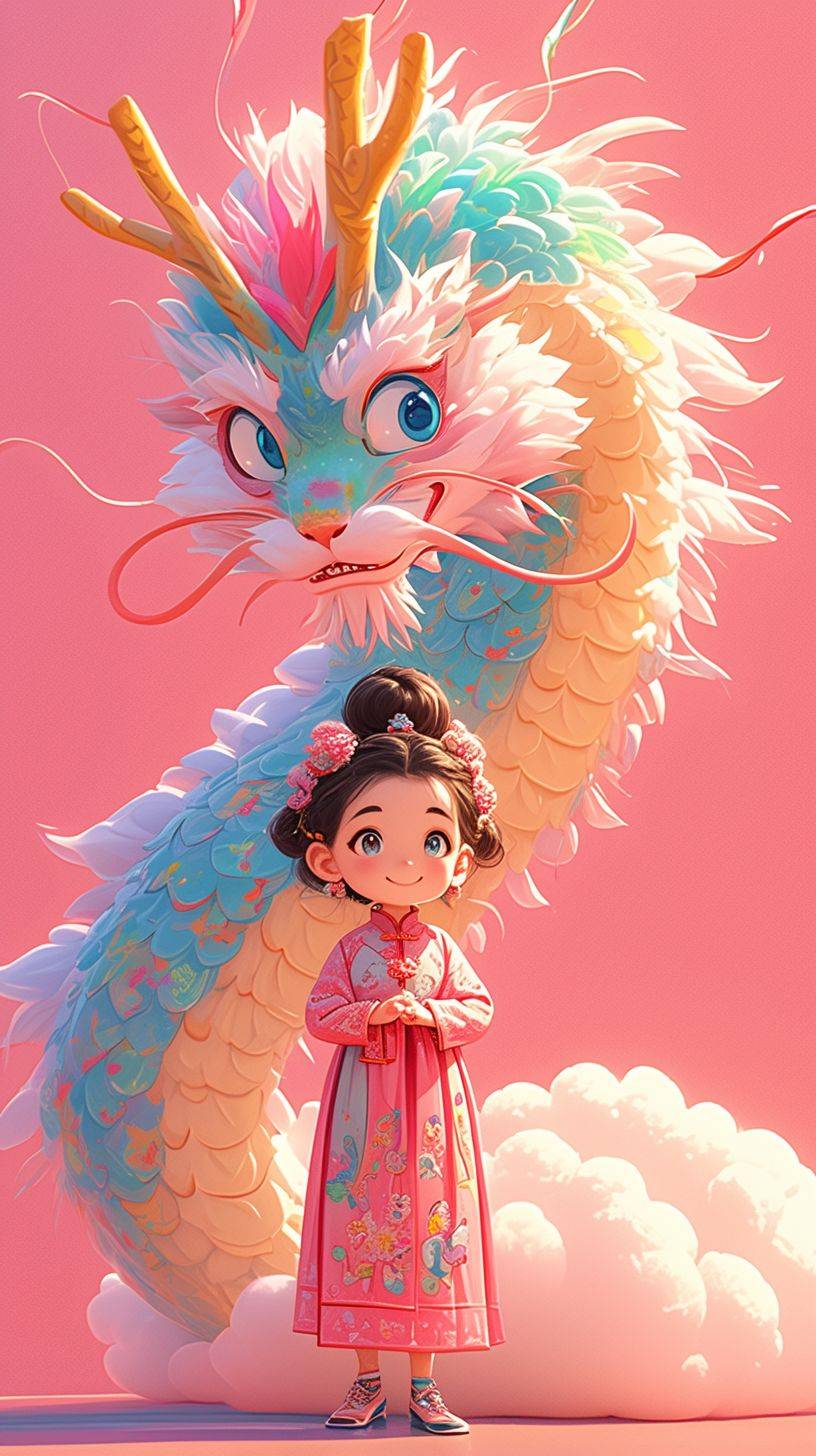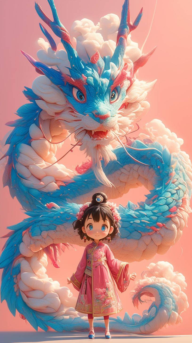Pixar animation style, Chinese New Year, pink background, made of marshmallow material, a big blue and pink Chinese dragon with a big smile, its tail is like a cloud, it has a colorful cloud on its head, standing next to it is a super cute little girl wearing traditional Chinese clothing, strong light effect --ar 9:16 --niji 6 --stylize 350