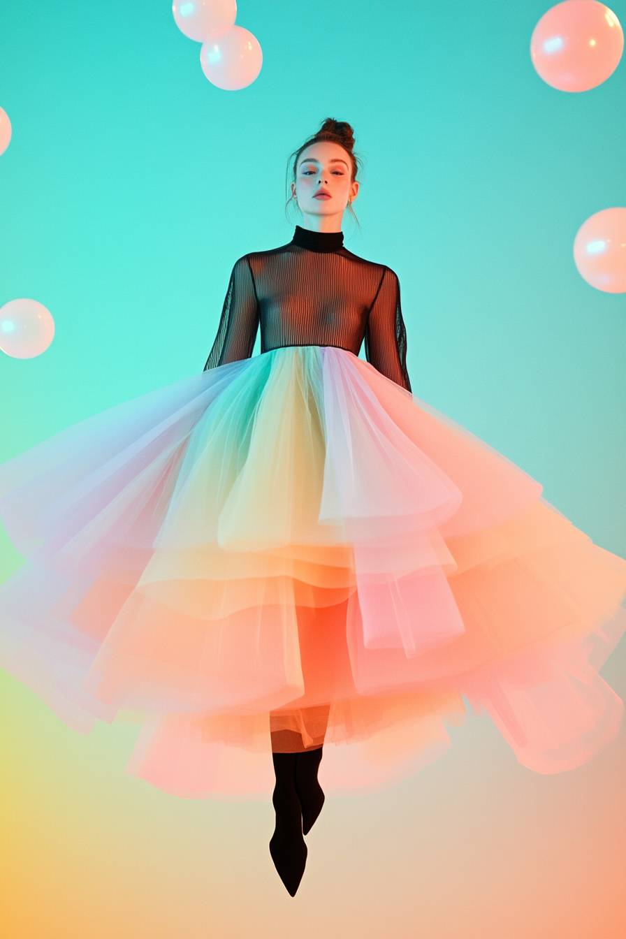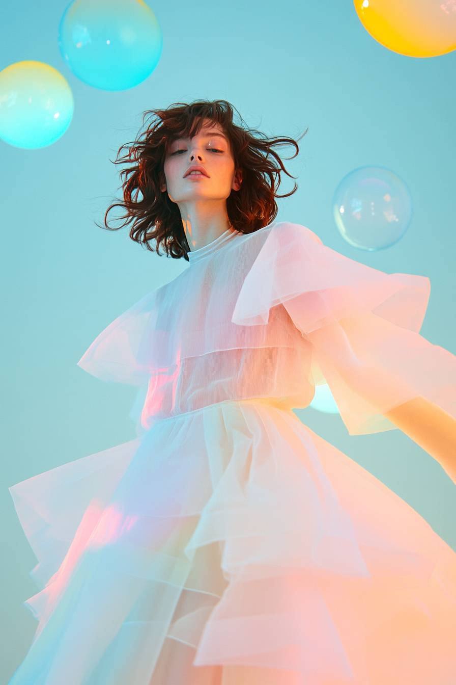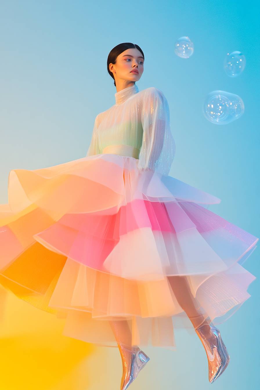A model suspended in the air wearing a voluminous gown against a gold to deep blue gradient backdrop, creating a dreamlike atmosphere.