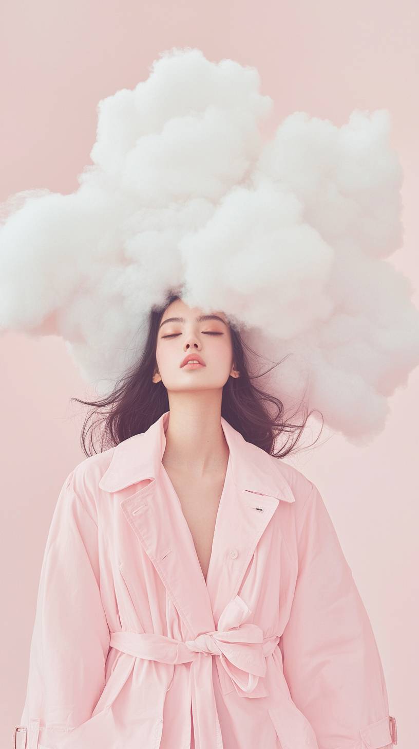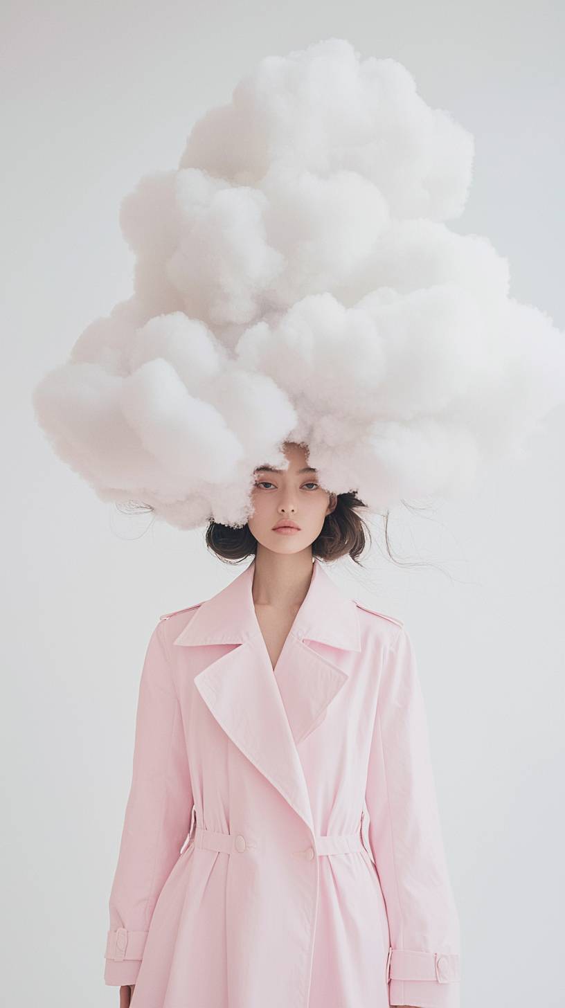 An elegant woman dressed in a flowing pastel pink trench coat paired with surreal, cloud-shaped accessories on her shoulders. Her hair flows upward, mimicking the soft texture of clouds, as she stands on a minimalistic white studio backdrop. Shot with a Nikon Z7 II, 50mm f/1.8 lens, ISO 100, dreamy lighting, professional sharpness, ethereal and surreal high-fashion photography. --ar 9:16 --quality 2 --profile rponfsn --v 6.1 --style raw