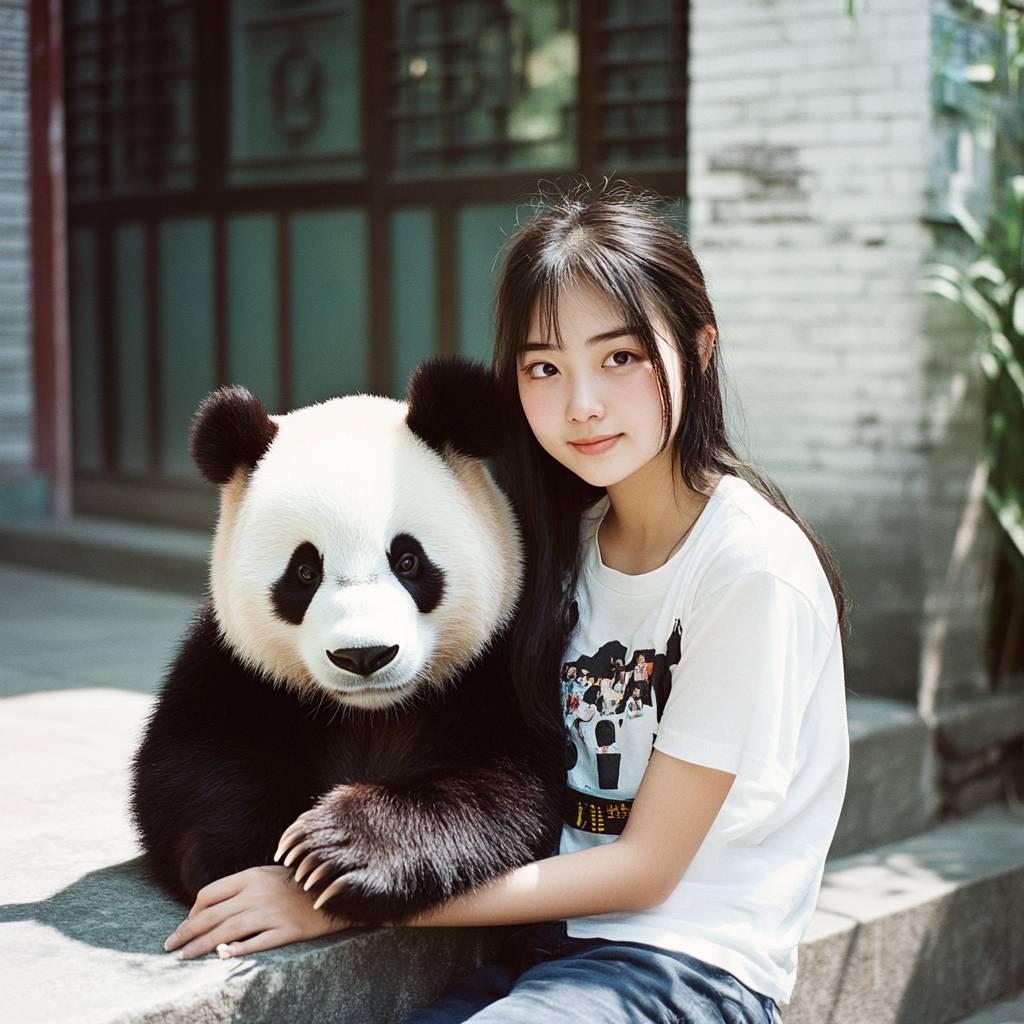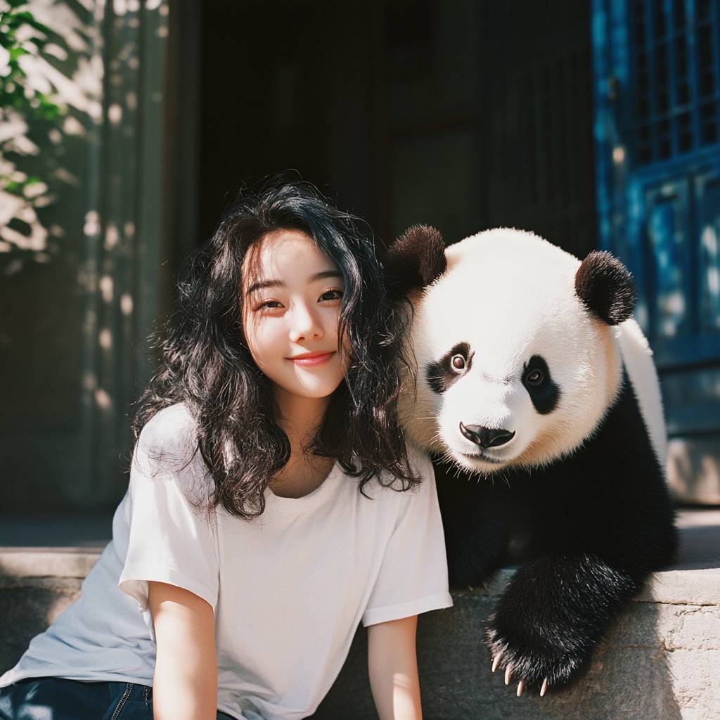 18 years old Japanese-Chinese mixed beauty girl, mature and plump, fair skin, white short-sleeved T-shirt, sitting on the steps of the courtyard looking at the camera and smiling, the wind blowing her hair, beside her is a cute giant panda, bear claws resting on the girl's shoulders, Andrew Wyeth style, high sensitivity coarse grainy film texture, shot by Fujifilm X100VI, aperture 5.6 --stylize 50 --v 6.1 --style raw