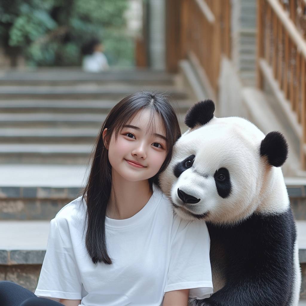An 18-year-old Japanese-Chinese mixed beauty girl in a white T-shirt sits on the courtyard steps, smiling, with a cute giant panda beside her.