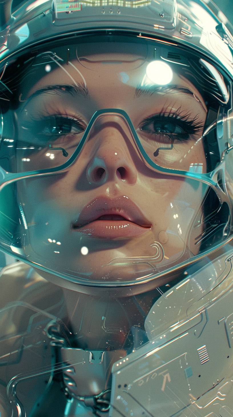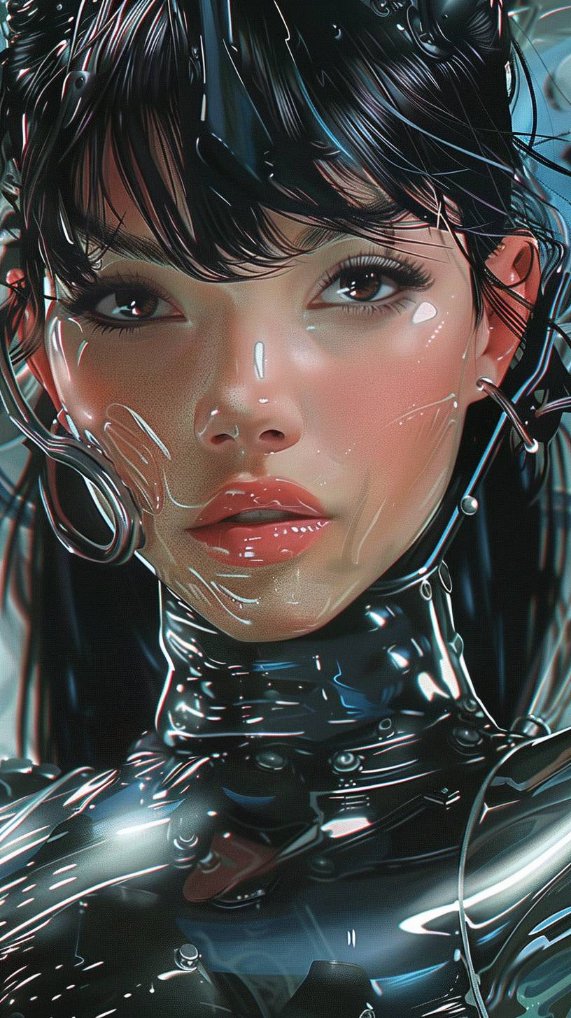 A beautiful woman in a futuristic plastic suit in a cyberpunk setting, styled like 80s anime, with a hyper-detailed close-up shot.
