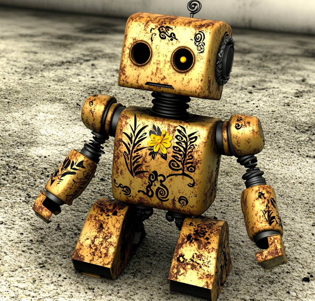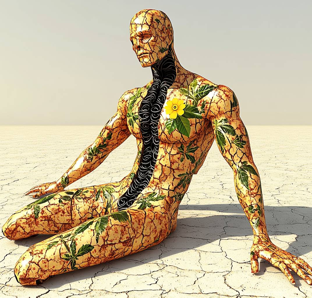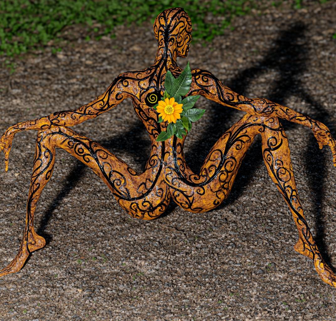 3d model of ancient headless robot broken on the ground made from rusted ornate golden skin, black spiraling details on skin, jungle themed with leaves and flowers on body and neck, has no left arm, the head is missing and replaced by a small yellow flower with an eye in the center, full body shot, reclaimed earth background, blender render, old playstation style, slightly pixelated --no head --chaos 80 --ar 98:93 --v 6.1