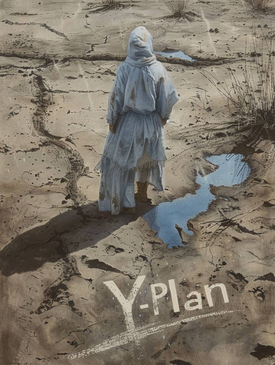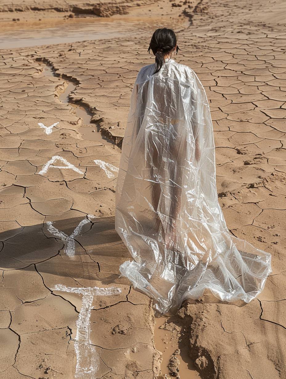 A woman dressed in frost-like gauze is walking in the hot desert. A close-up shot shows "Y-Plan" written on the desert . There are traces of water on the ground she walked on. The details are clear and the depiction is realistic. --ar 3:4 --chaos 10 --v 6.0