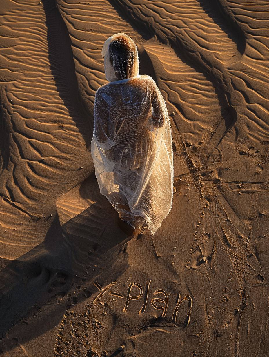 A woman dressed in frost-like gauze is walking in the hot desert. A close-up shot shows 'Y-Plan' written on the desert. There are traces of water on the ground she walked on. The details are clear and the depiction is realistic.