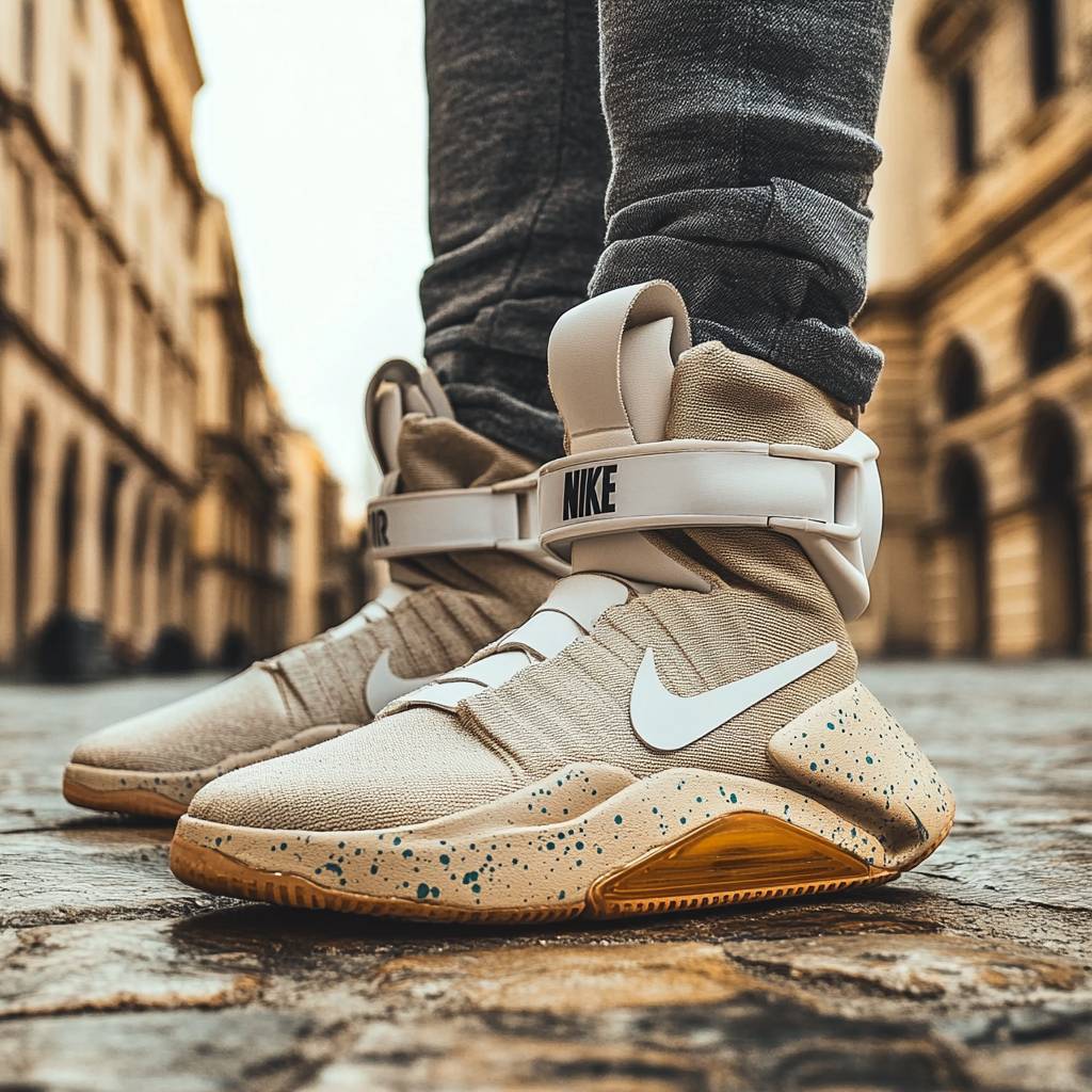 Nike Air Mag shoes, blended with the Nike Huarache, combined with the OFF-WHITE style, with midfoot strap, in the NET TAN colorway.