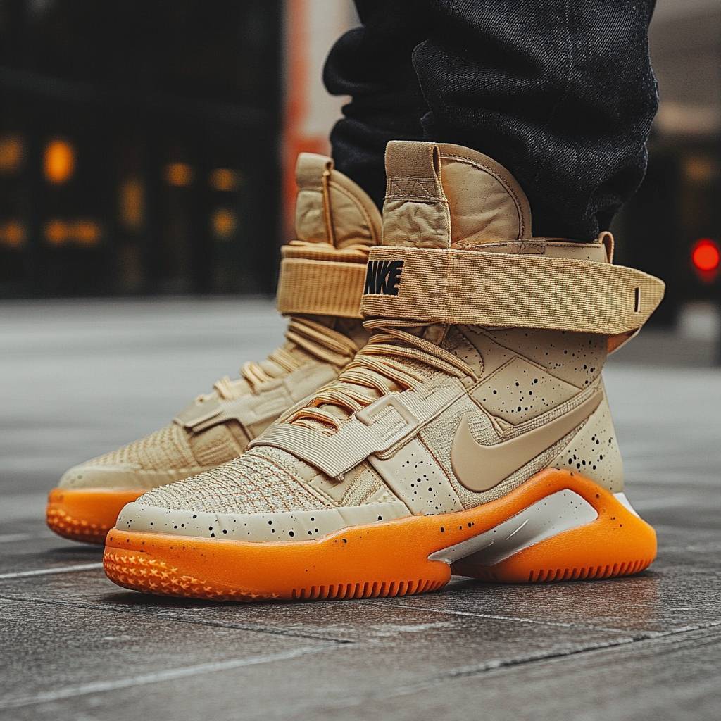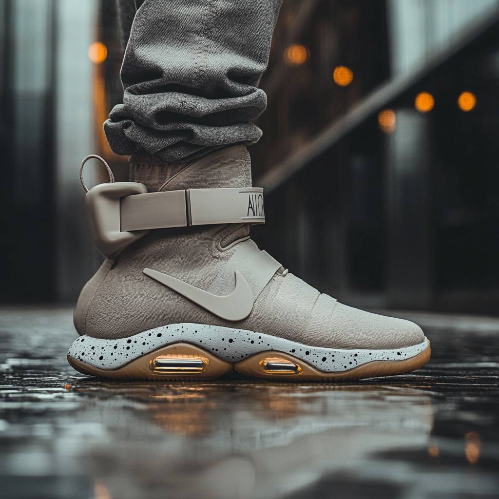 Nike air Mag shoes, blended with the Nike Huarache, Blended with the OFF-WHITE style, with midfoot strap, in the NET TAN colorway --stylize 250 --v 6.1