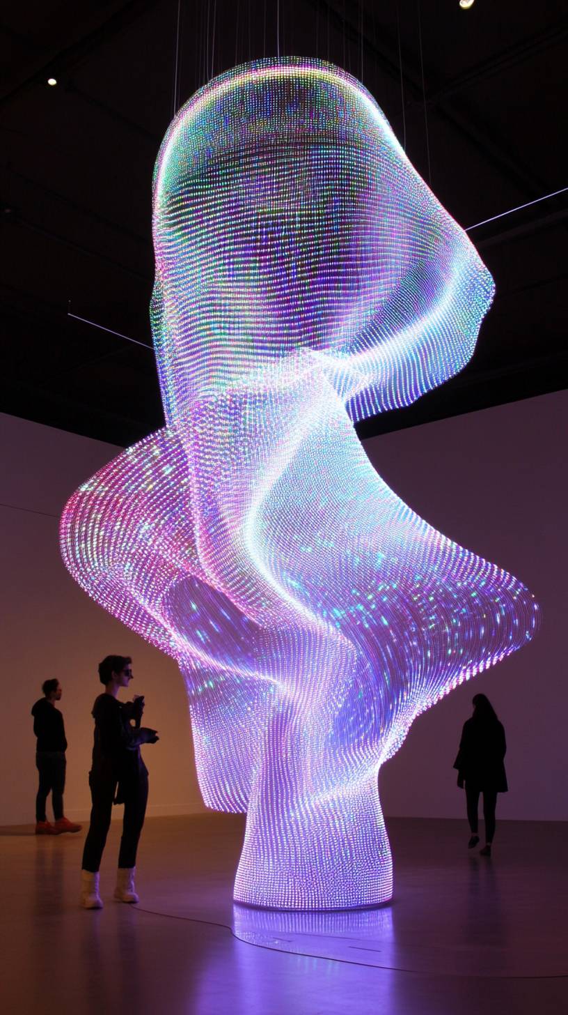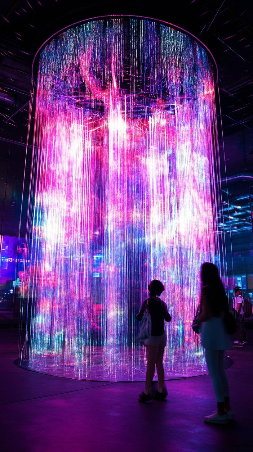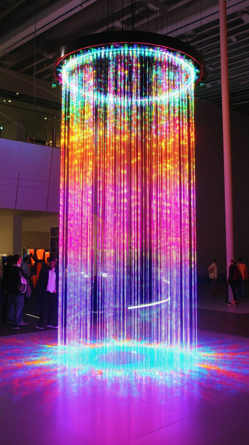 a giant light sculpture which is made of thousands of hanging addressable LED strings, which when spun, create a persistence of vision hologram effect, like a hologram fan, amazing, highly detailed, dazzling --ar 9:16 --v 6.1 --style raw