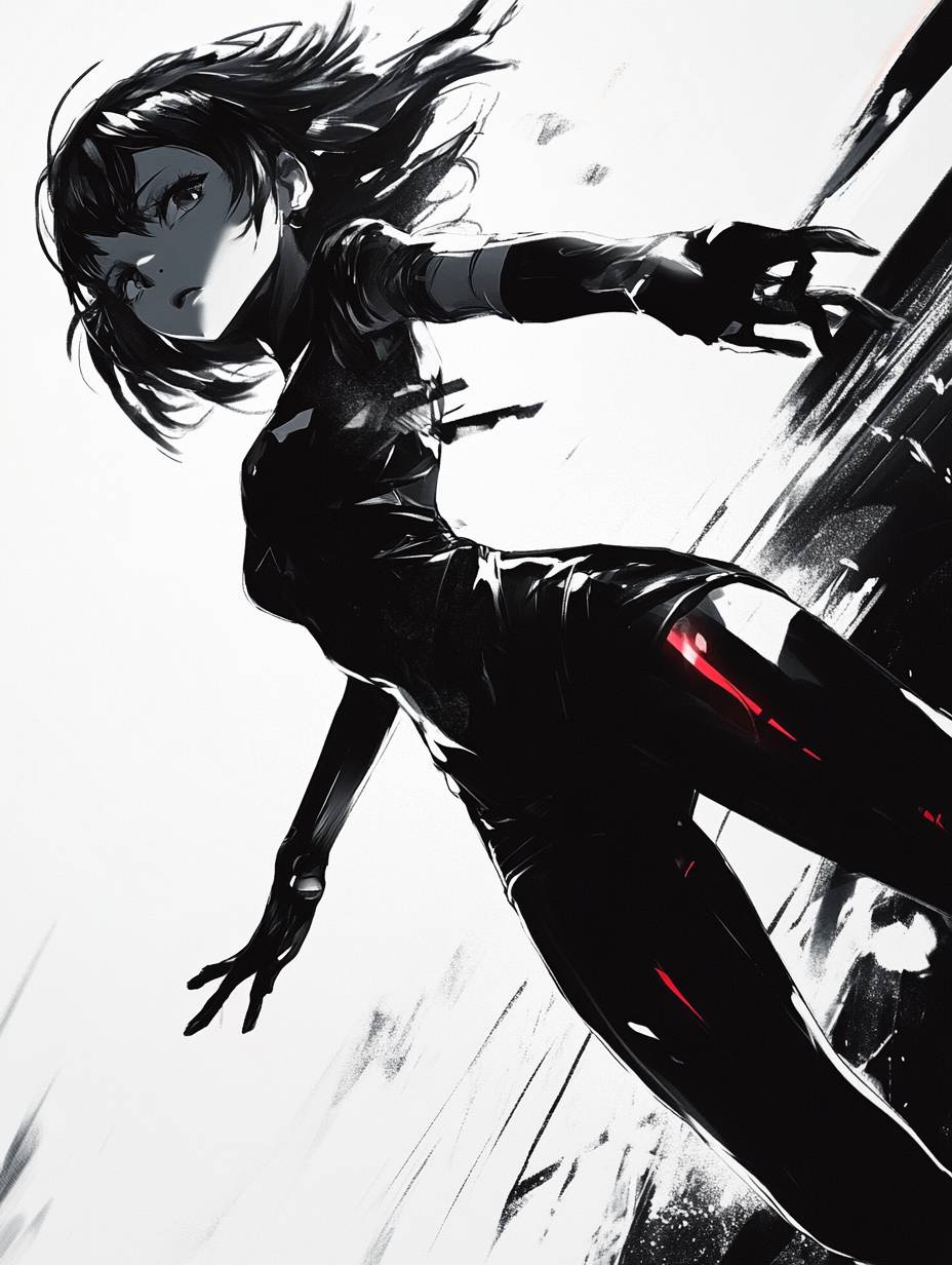 A female figure in a playful, exaggerated manga-style pose. The camera captures her from a low angle, emphasizing the dynamics of her pose. High-energy lighting with glowing effects, sharp shadows, and a clean minimalistic background. Abstract and edgy fashion inspiration. --ar 3:4 --v 6.1 --style raw