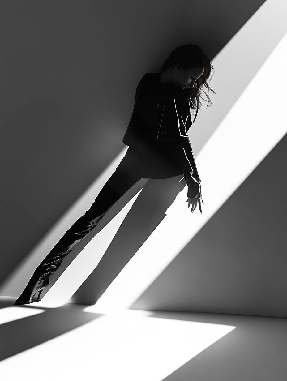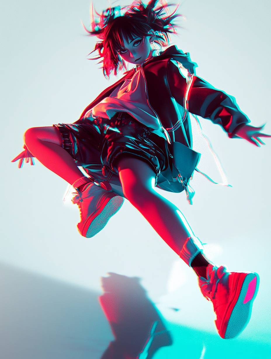 A female figure in a playful, exaggerated manga-style pose. The camera captures her from a low angle, emphasizing the dynamics of her pose. High-energy lighting with glowing effects, sharp shadows, and a clean minimalistic background. Abstract and edgy fashion inspiration.