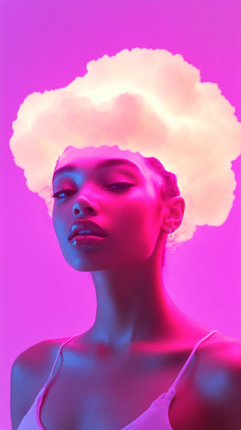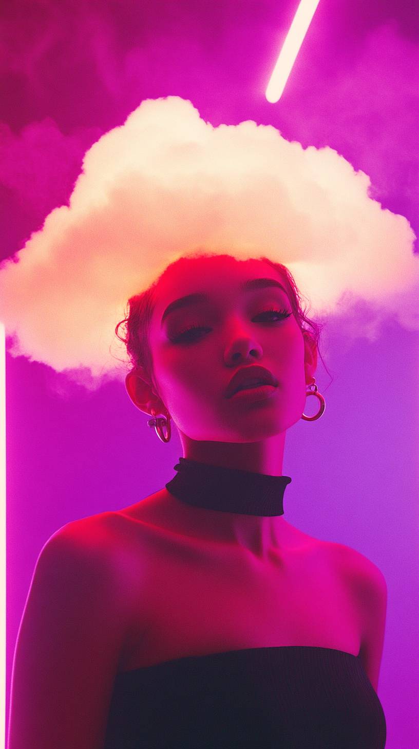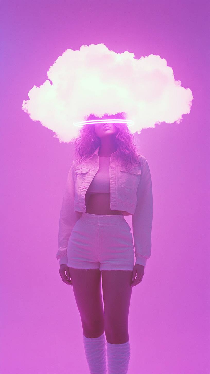 A full-body shot of a beautiful young woman with a glowing stormy neon cloud covering her head against a neon purple studio background.