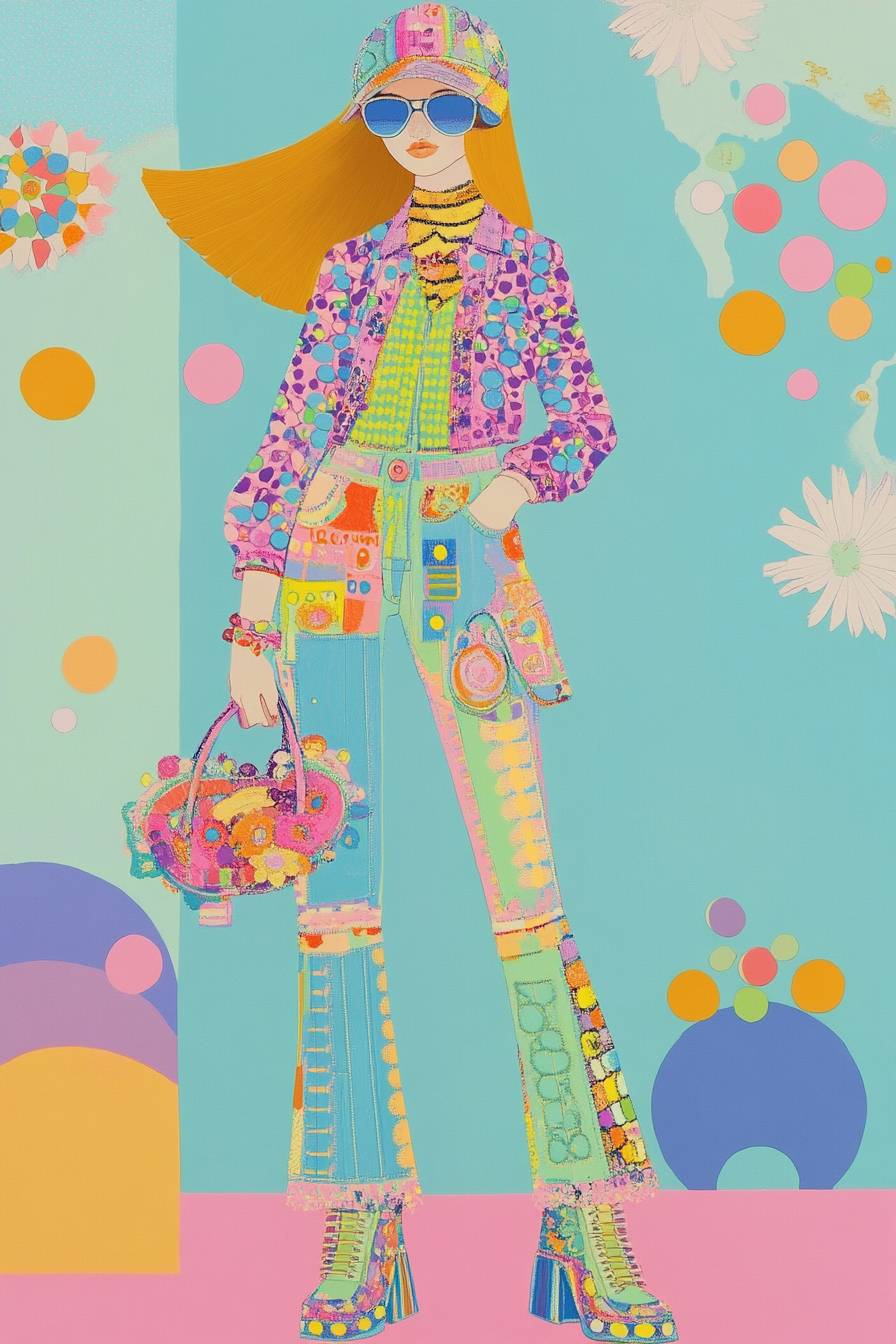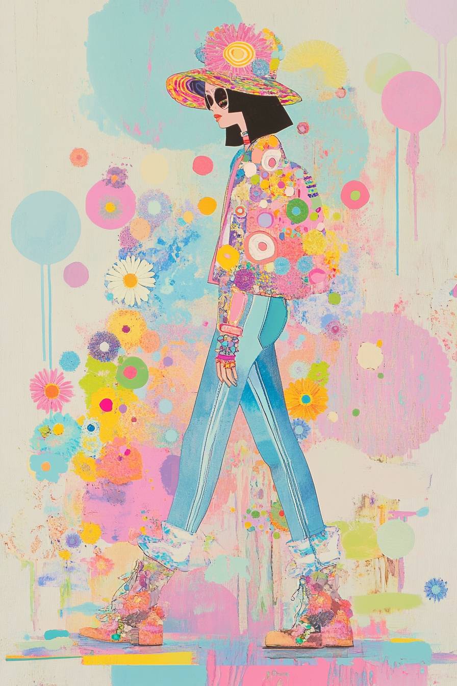 Full body, fashionable pastel hippie girl, a modern twist of psychedelic overload.