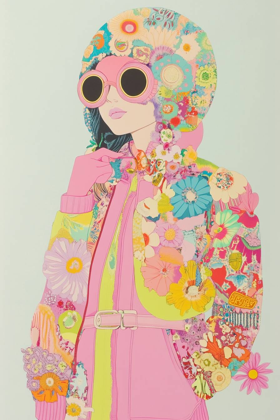 Full body, fashionable, pastel, hippie girl, A modern twist of psychedelic overload, Peter max --ar 2:3 --profile um37oj2 --v 6.1 --style raw