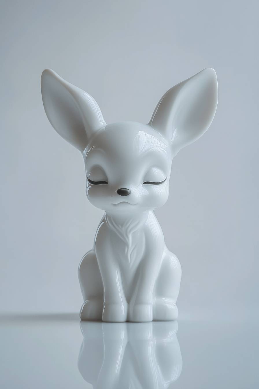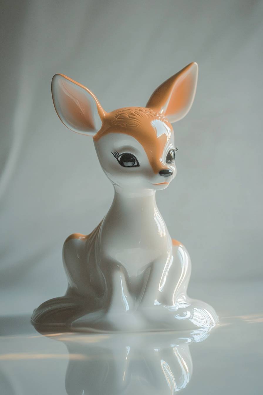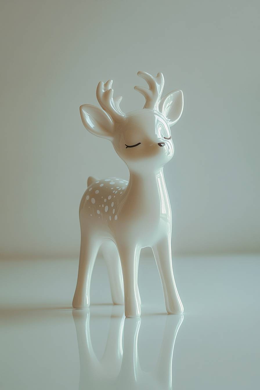 Ceramic New Year's toy in the shape of Bambi, white. Sad expression. White background with reflection from the object. Cinematic. Realistic. Shot on an Arri Alexa 35. Shot on a Kowa Cine Pominar Spherical Prime lens.