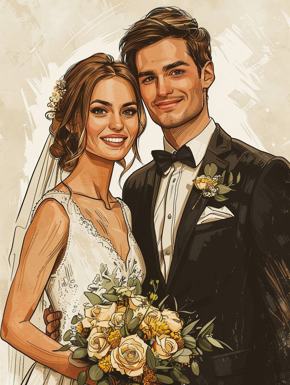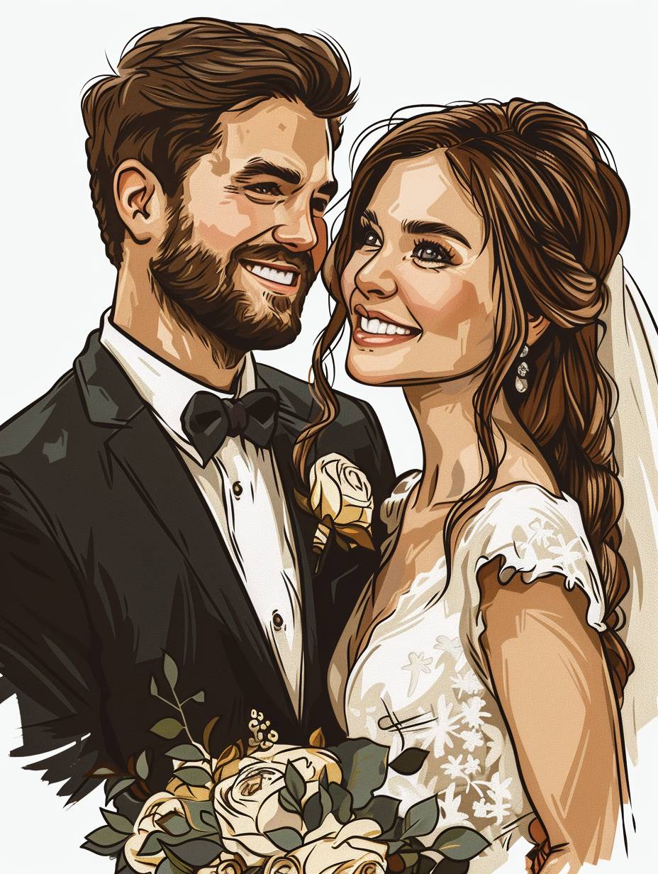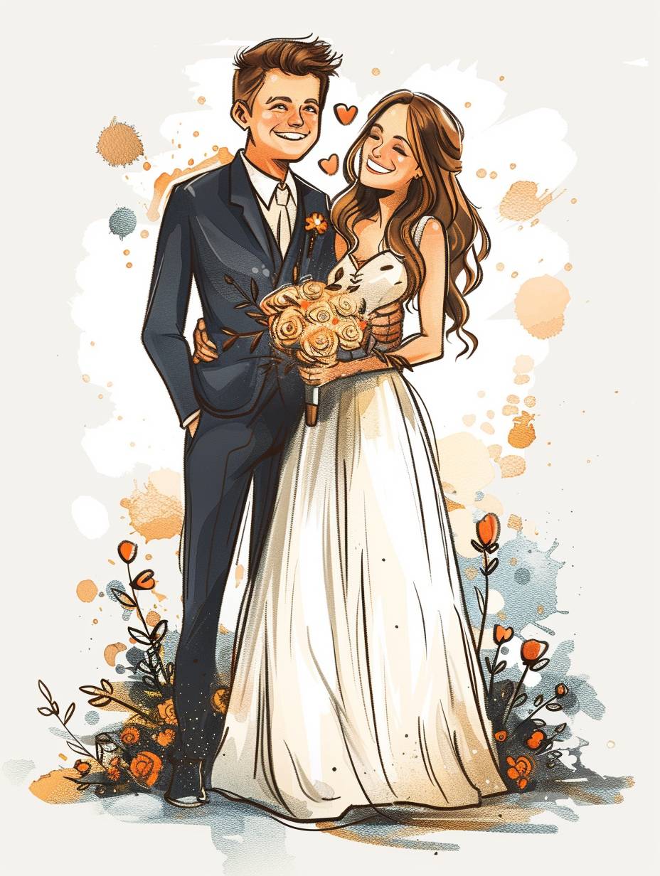 Modern Line Icon, a wedding drawing that shows the groom and bride,full body, Cute Avatar, Smiling, Bold Outline, bold Color, white background --s 500 --ar 3:4 --v 6.0