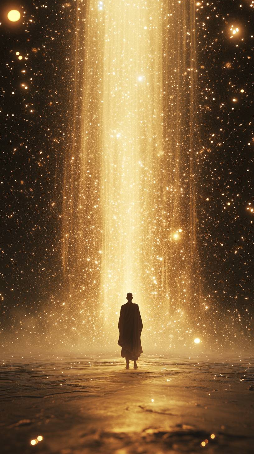 Using ultra-fine sand particles to create a scene filled with glowing scriptures floating in the air, with the outline of a monk, embodying a minimalist artistic conception. It is a masterpiece featuring Tyndall light with a luminous center, particle effects, and ethereal particles, complemented by extensive white space to evoke a mythical essence. The artwork is in high definition, 32K resolution, with particles suggesting the wind, set in a dark fantasy theme. --v 6.1 --ar 9:16 --style raw