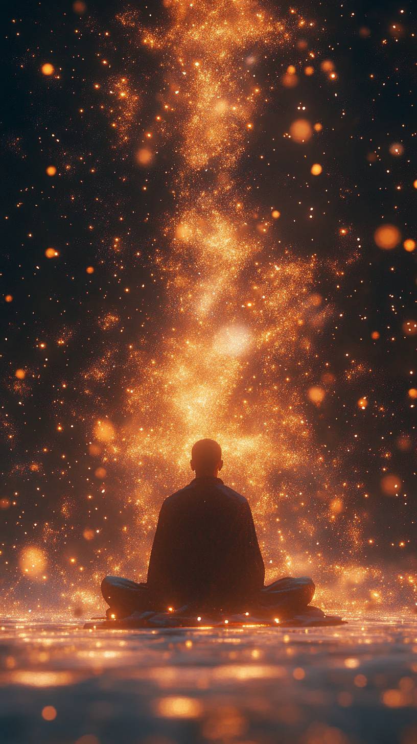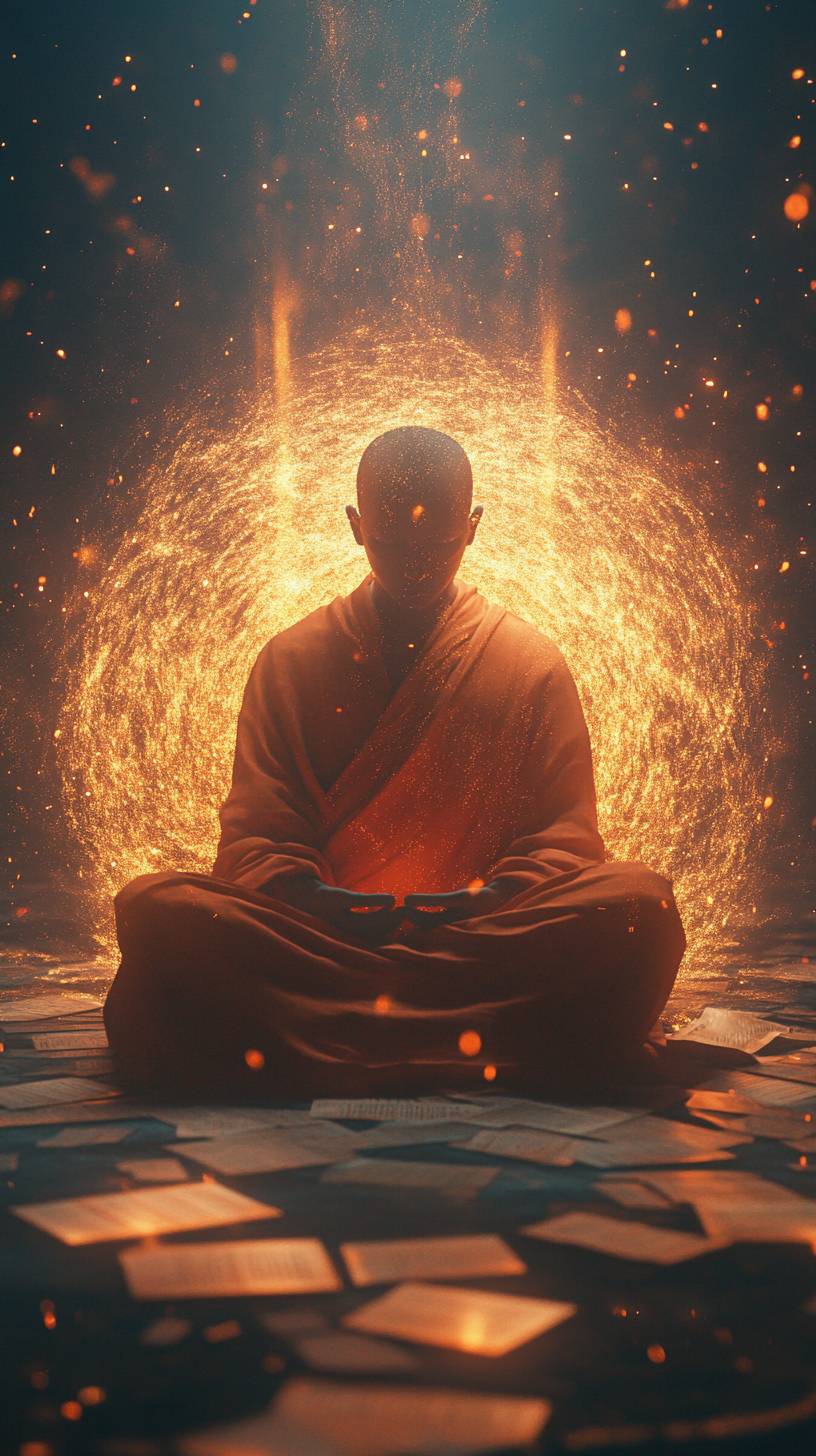 Creating a scene filled with glowing scriptures using ultra-fine sand particles, featuring the outline of a monk in a minimalist artistic conception.