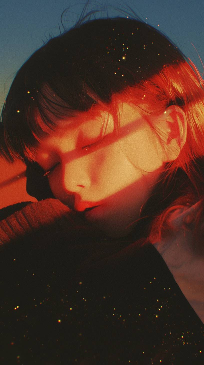 A grainy glitch photo of an Asian girl with closed eyes, covered in glow, resembling a dreamy 90s Y2K aesthetic.