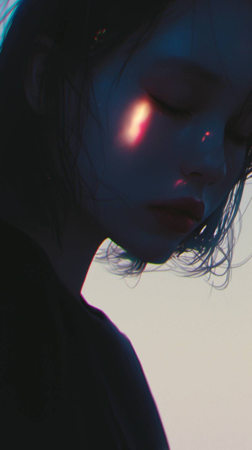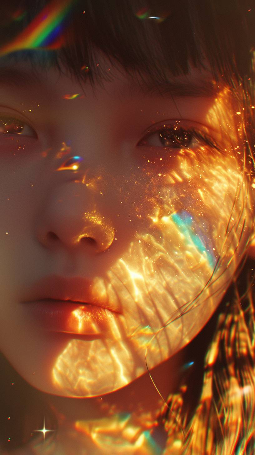 A grainy glitch photo of an Asian girl with eyes closed and eyes covered in glow style, dreamcore soft focus lens flare in 90s aesthetic y2k style dreamy --ar 9:16 --niji 6