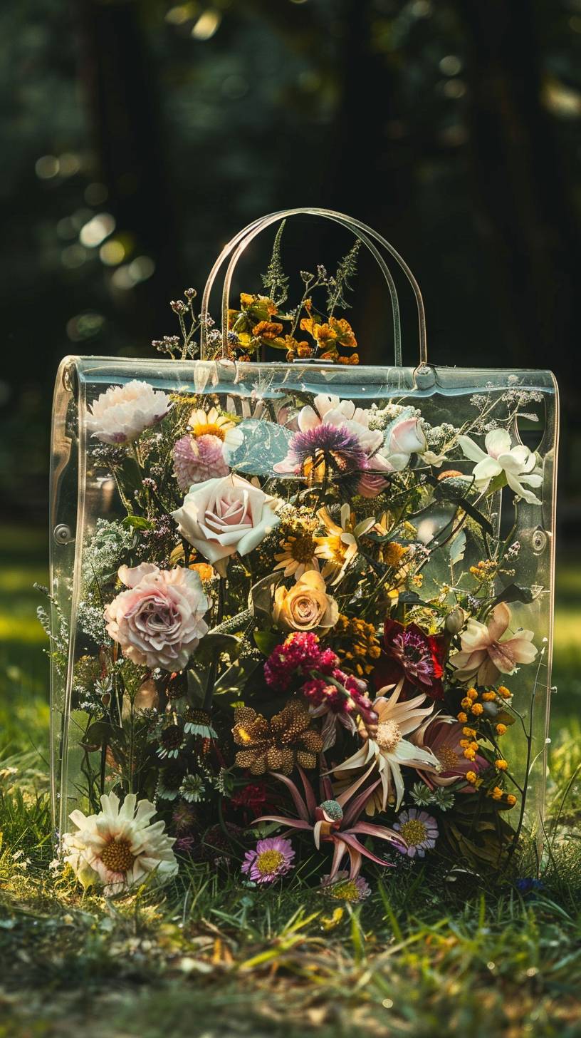A transparent and exquisite luxury bag, filled with all kinds of expensive and exquisite flowers, was placed on the grass --ar 9:16 --v 6.0