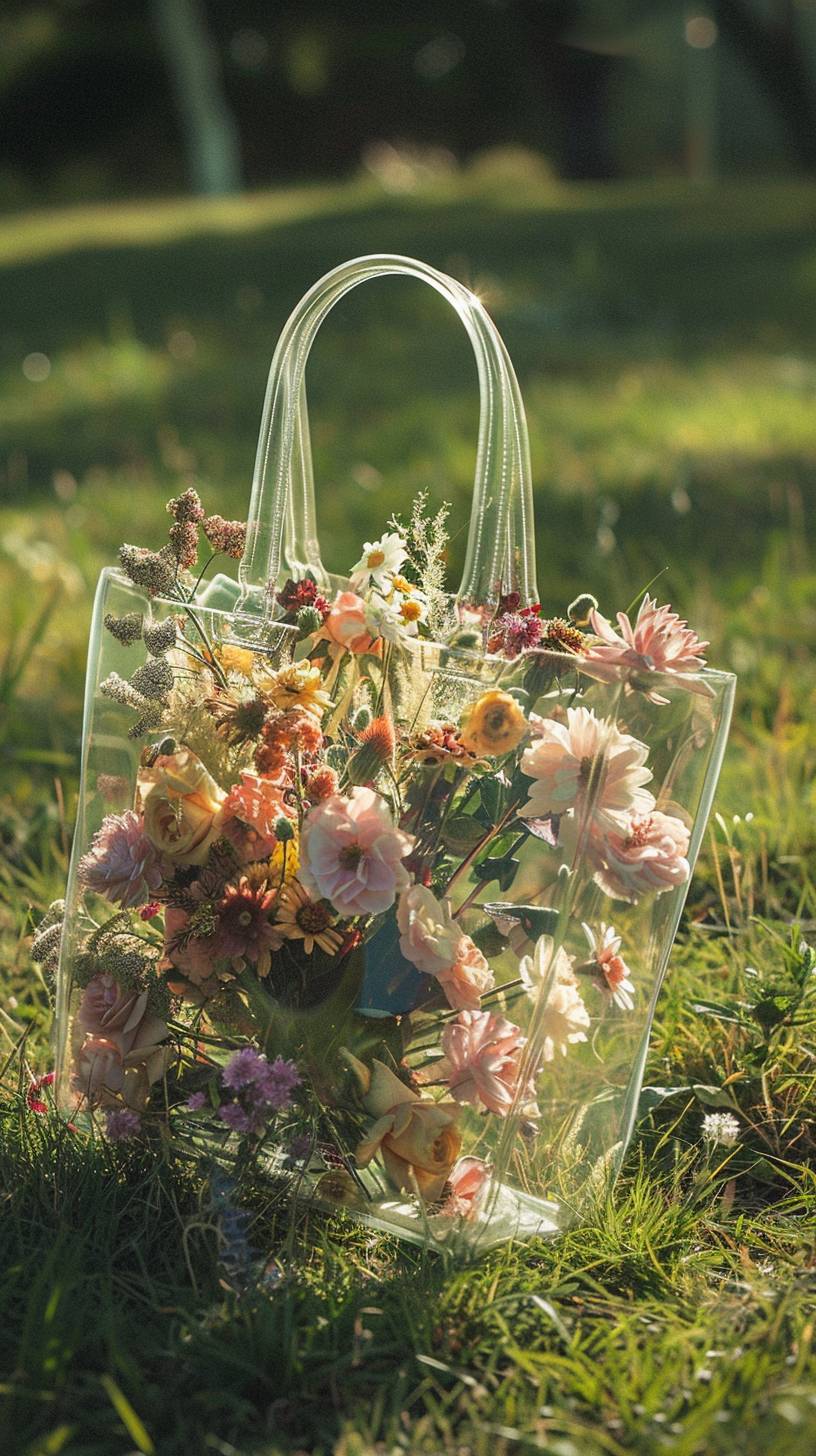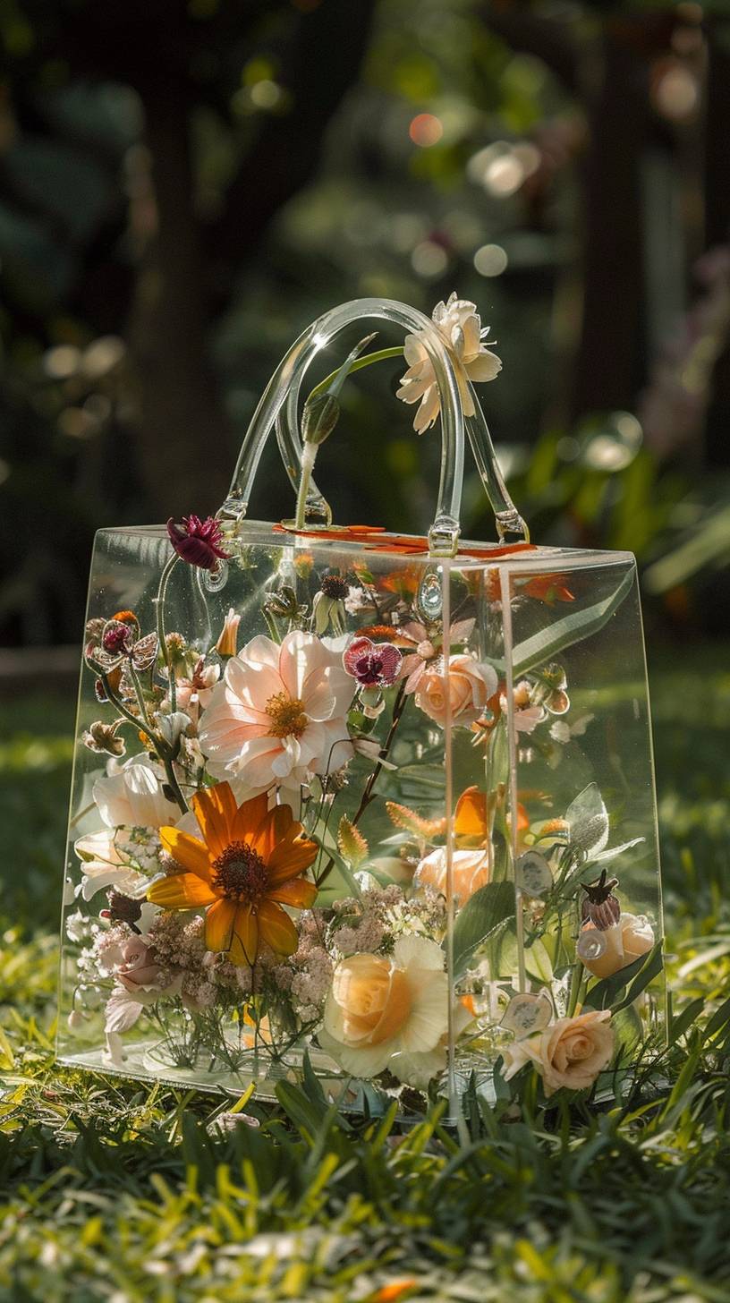 A transparent and exquisite luxury bag filled with various expensive and exquisite flowers was placed on the grass.