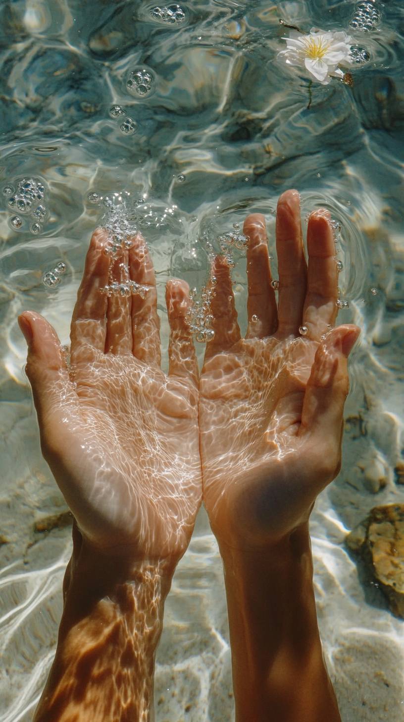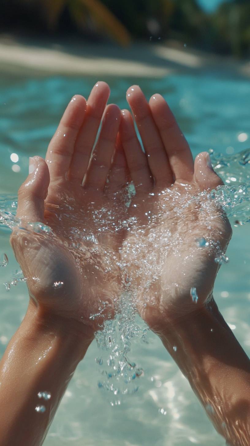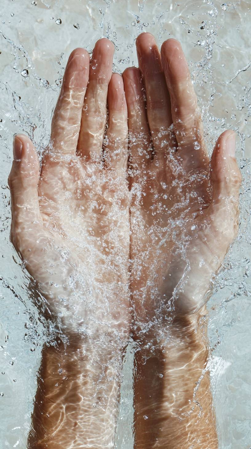 palms folded together, five fingers on each hand. clean and clear water with splashes in the palms of the hands --ar 9:16 --v 6.1 --style raw