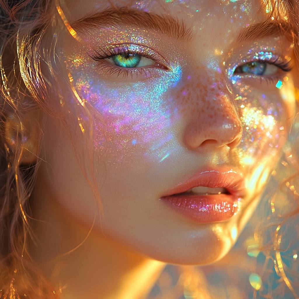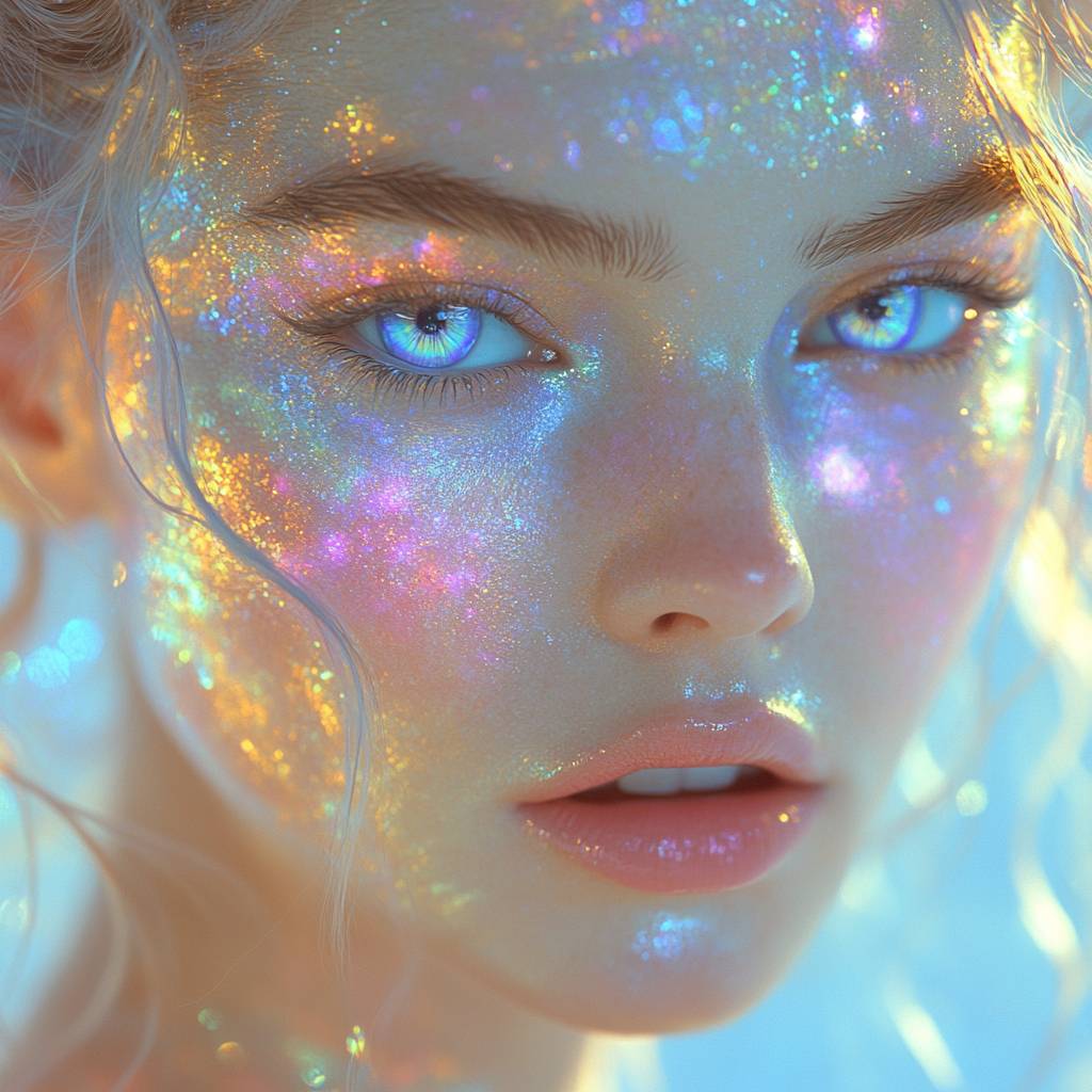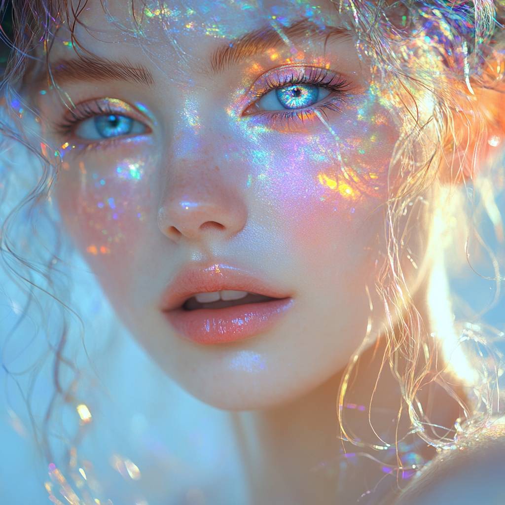 Illustrate a woman with soft, pastel makeup that shifts colors like a prism, giving her an ethereal, fairy-like appearance. Her skin has a pearlescent sheen, and she wears a delicate ring with a shimmering, iridescent stone. The background is a dreamy, pastel gradient, enhancing her magical vibe.