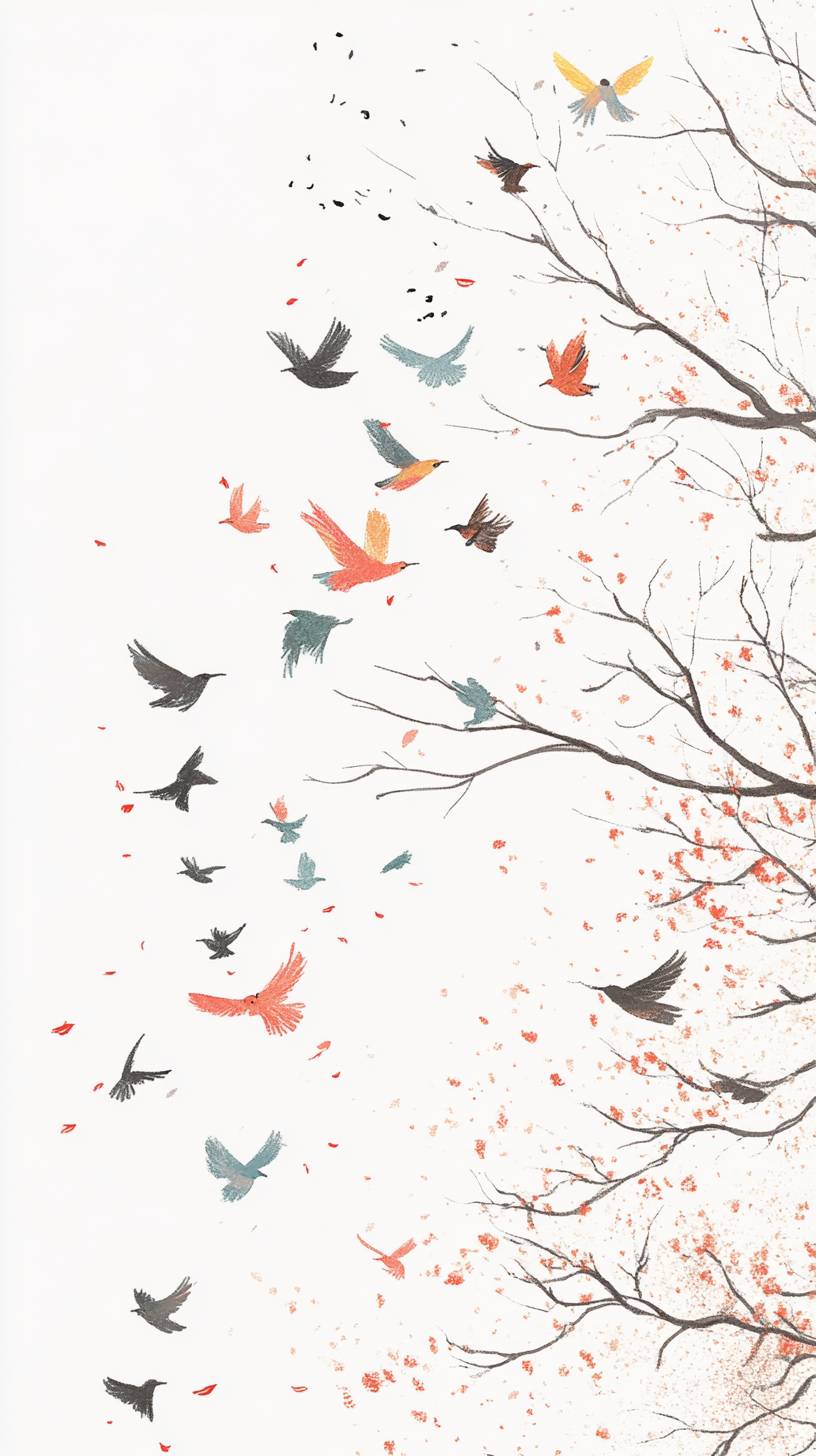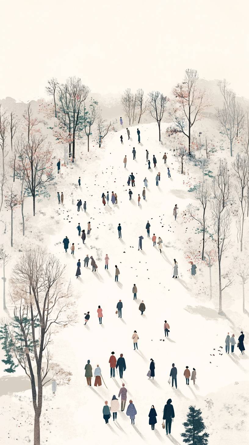 Art poster in a flat illustration style, inspired by Wu Guanzhong's techniques and color palette, with a bird's-eye view perspective. Simple brush strokes depict scattered figures emerging from the bottom of the picture, gradually transitioning from dense to sparse. They aspire to nature. The colors are bright, with a blank background that embodies the beauty of white space. A masterpiece, an award-winning work. --v 6.1 --ar 9:16