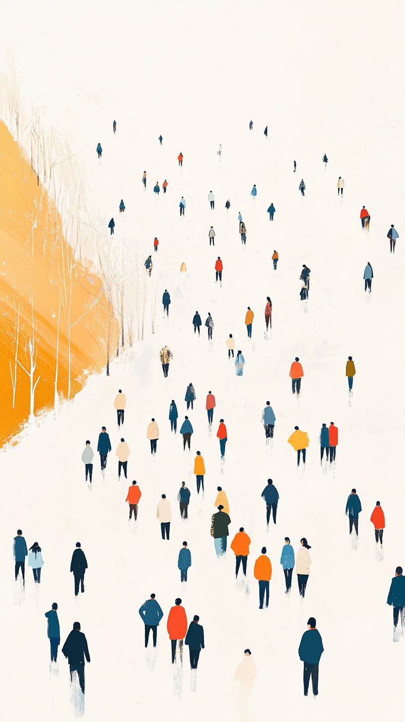 An art poster in a flat illustration style, inspired by Wu Guanzhong's techniques and color palette, featuring a bird's-eye view perspective. Simple brush strokes depict scattered figures emerging from the bottom of the picture, gradually transitioning from dense to sparse. They aspire to nature. The colors are bright, with a blank background that embodies the beauty of white space. A masterpiece, an award-winning work.