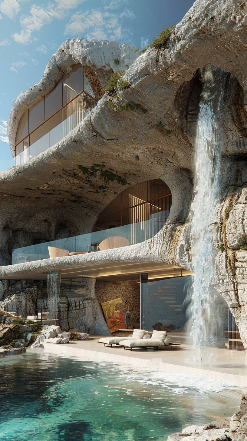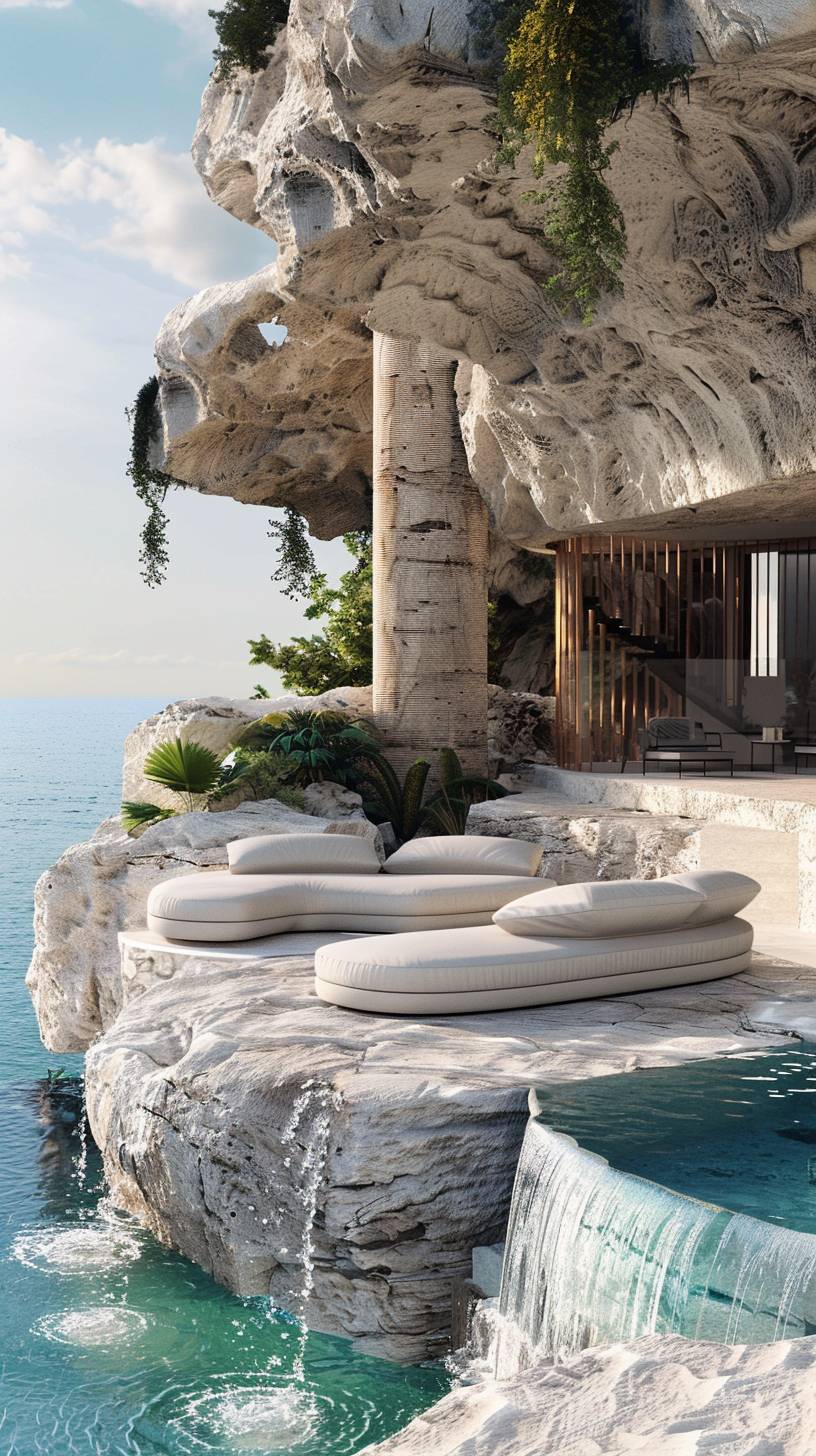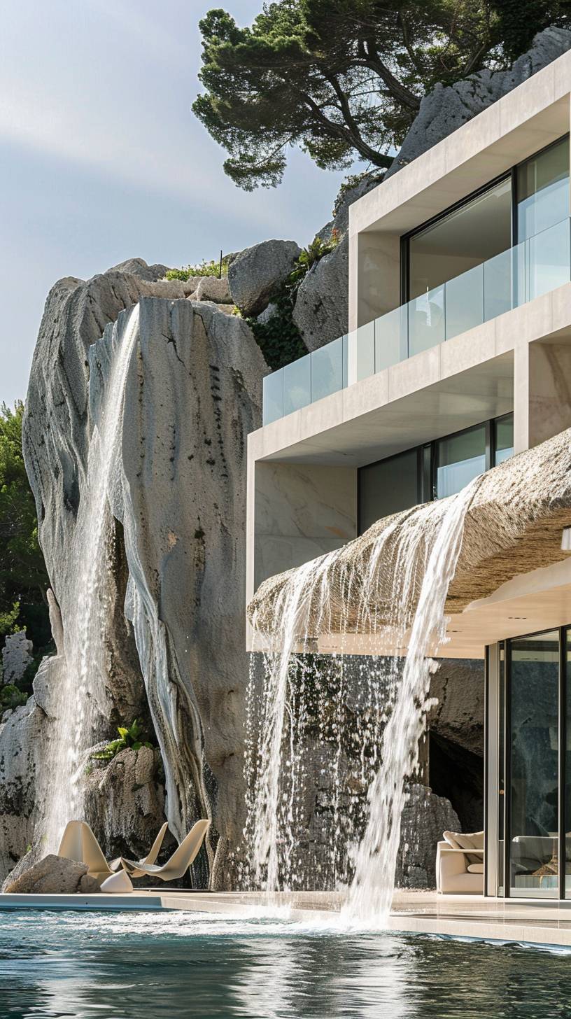 Focused exterior view on a living room of a limestone rock regular blocks shaped villa with sliding windows and timber screens in Provence along the cliff facing the sea, with waterfalls from the roof to the pool, designed by Zaha Hadid, with rocky textures and form, made of regular giant rock blocks stacked each other with infinity edge pool in front of it, blends in with the surrounding nature. Regular rock blocks. Giant rock blocks shaping the space. The image to capture the infinity edge profile of the pool and the flow of water going down creating a waterfall effect. Adriatic Sea. The design is sustainable and semi-prefab. The photo is shot on a Canon 5D Mark IV.