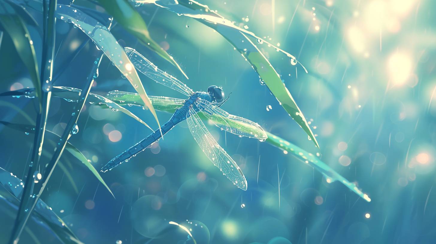 dewy dragonfly wings during a gentle rain, the wings catching light and creating a prism effect, with a soft-focus aquatic background, in the style of makoto shinkai --niji 6 --ar 16:9