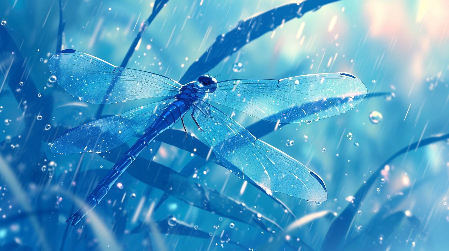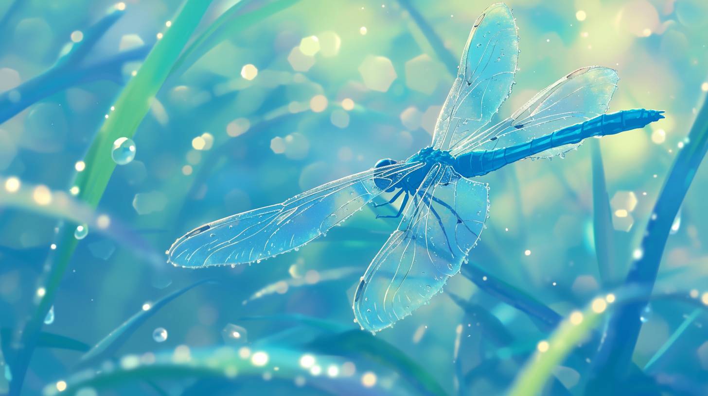 Dewy dragonfly wings during a gentle rain, the wings catching light and creating a prism effect, with a soft-focus aquatic background, in the style of Makoto Shinkai.