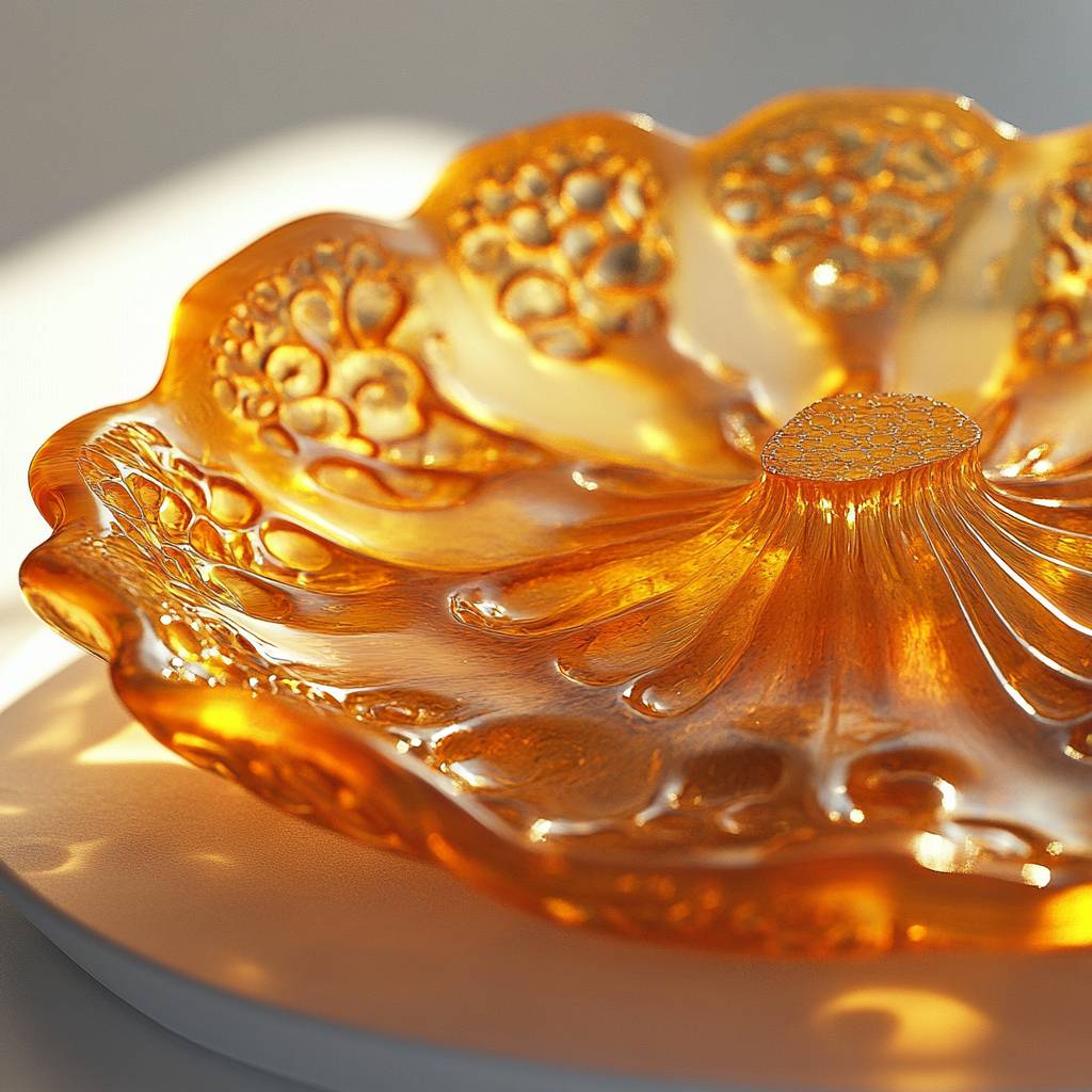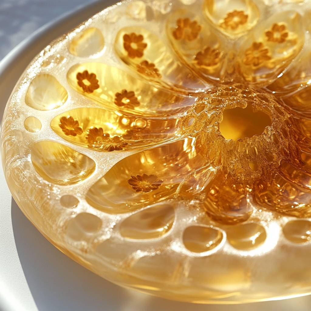 Masterpiece by a photography master, hyper-realistic, a crystal-clear lotus root with a jelly-like texture, dreamily transparent, golden transitions, smooth surface, crystalline lotus root, bright golden yellow, sunlight filtering through the lotus root, placed on a clean white plate, macro perspective, close-up shot, photography-level lighting effects, white background, high-quality details, ultra-fine CG, high resolution, best quality, C4D, 32K wallpaper. --v 6.1