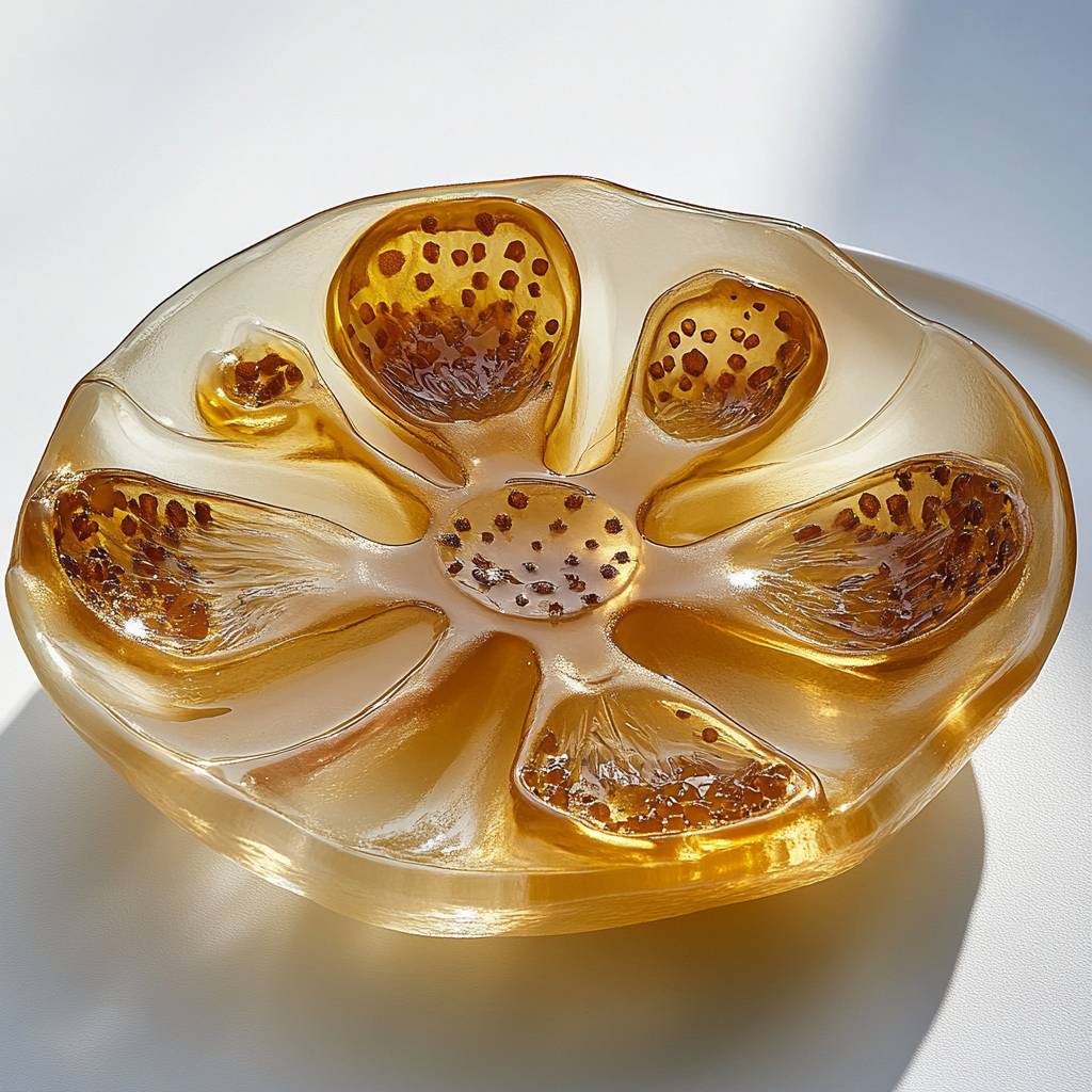 Masterpiece by a photography master, hyper-realistic, a crystal-clear lotus root with a jelly-like texture, dreamily transparent, golden transitions, smooth surface, crystalline lotus root, bright golden yellow, sunlight filtering through the lotus root, placed on a clean white plate, macro perspective, close-up shot, photography-level lighting effects, white background, high-quality details, ultra-fine CG, high resolution, best quality, C4D, 32K wallpaper.