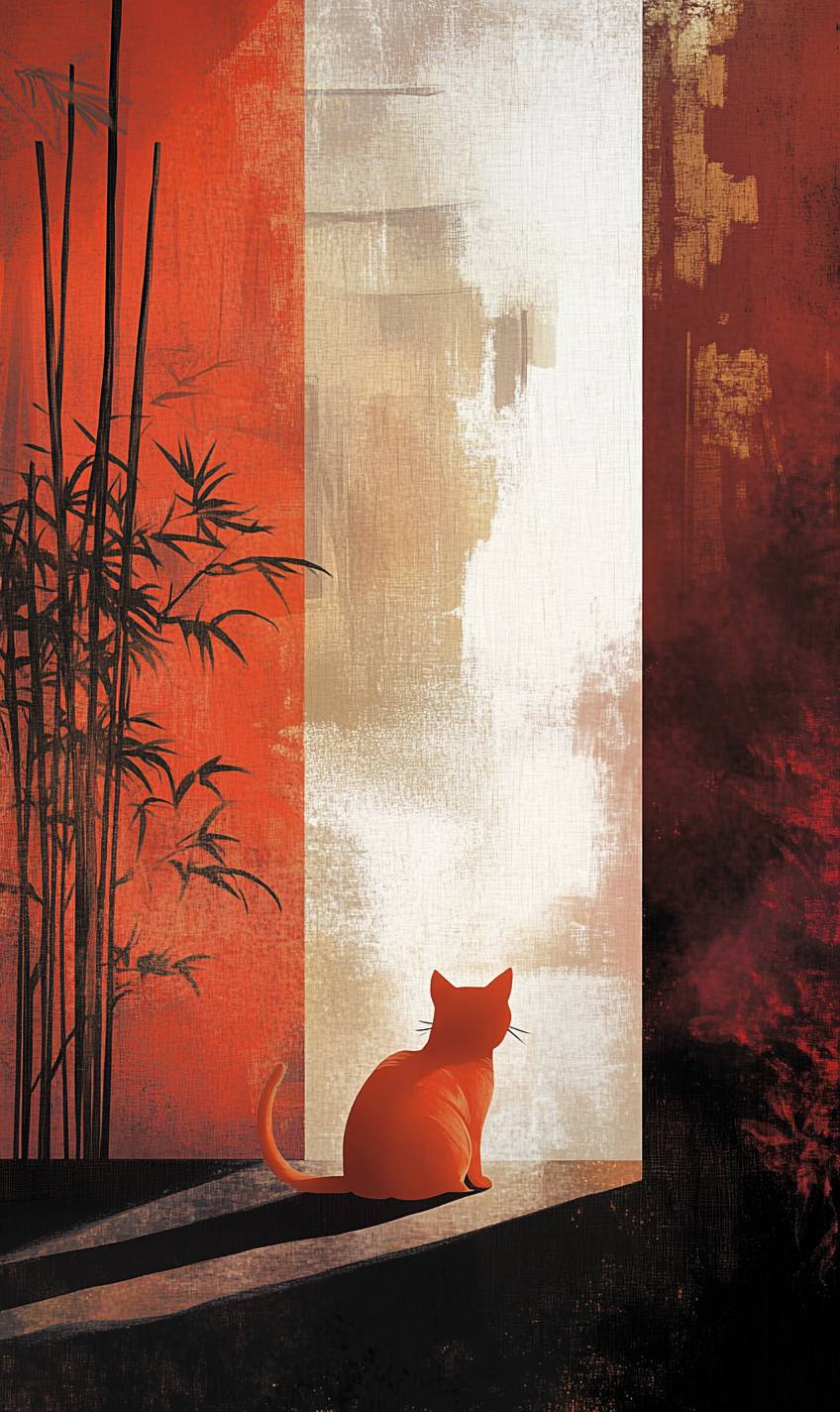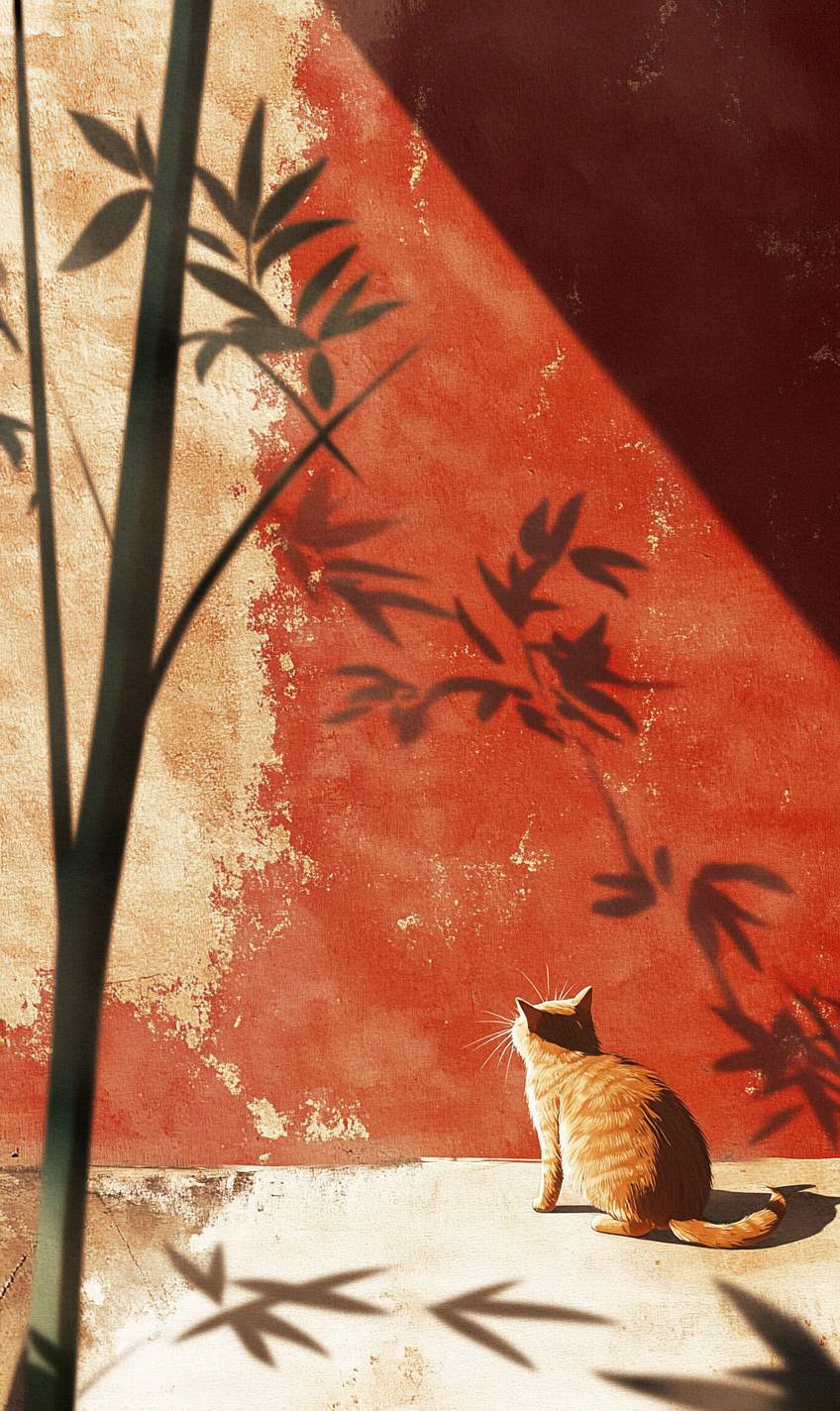 Flat illustration, Song Dynasty meticulous painting, royal garden under the sunlight, close-up of the red walls in the garden, dappled bamboo shadows, artificial hills, an orange cat playing with its shadow, cat's shadow on the wall, golden light, flowing dust, rock pigments, gold foil rock pigments, fairyland, retro aesthetics, torn paper, dyeing, gradient, rice paper, blurred, low quality, impurities. --v 6.1 --ar 3:5