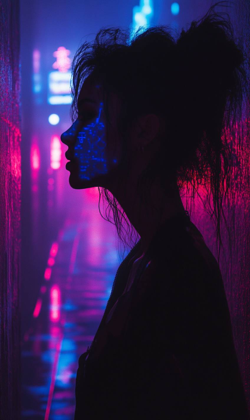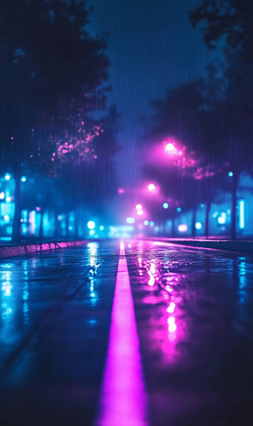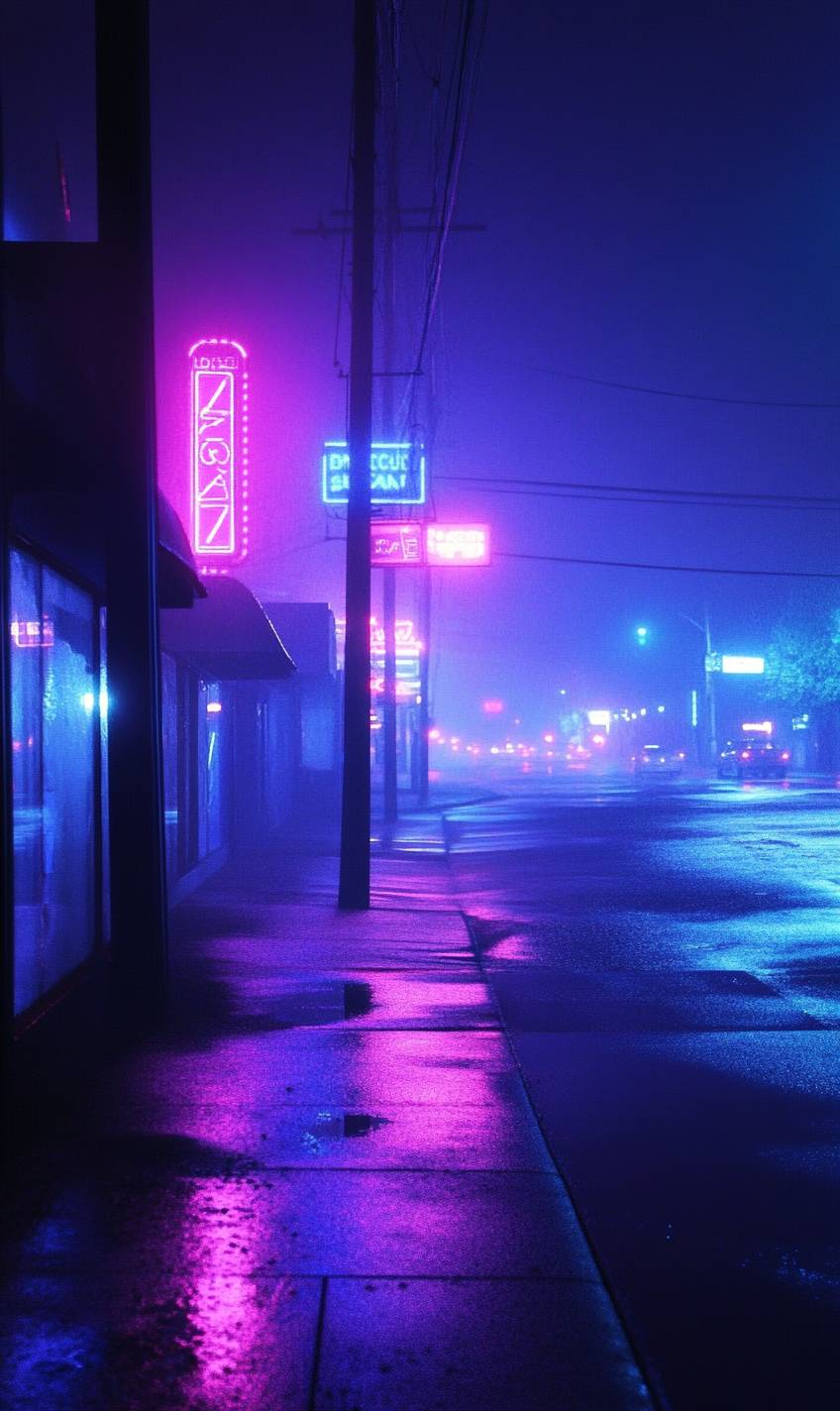 Neon cityscape at night, glowing lights, reflective streets, cyberpunk vibes, high-tech structures, atmospheric fog, dynamic light reflections, retro futurism, cinematic composition, dark tones, electric blues and purples --v 6.1 --ar 3:5