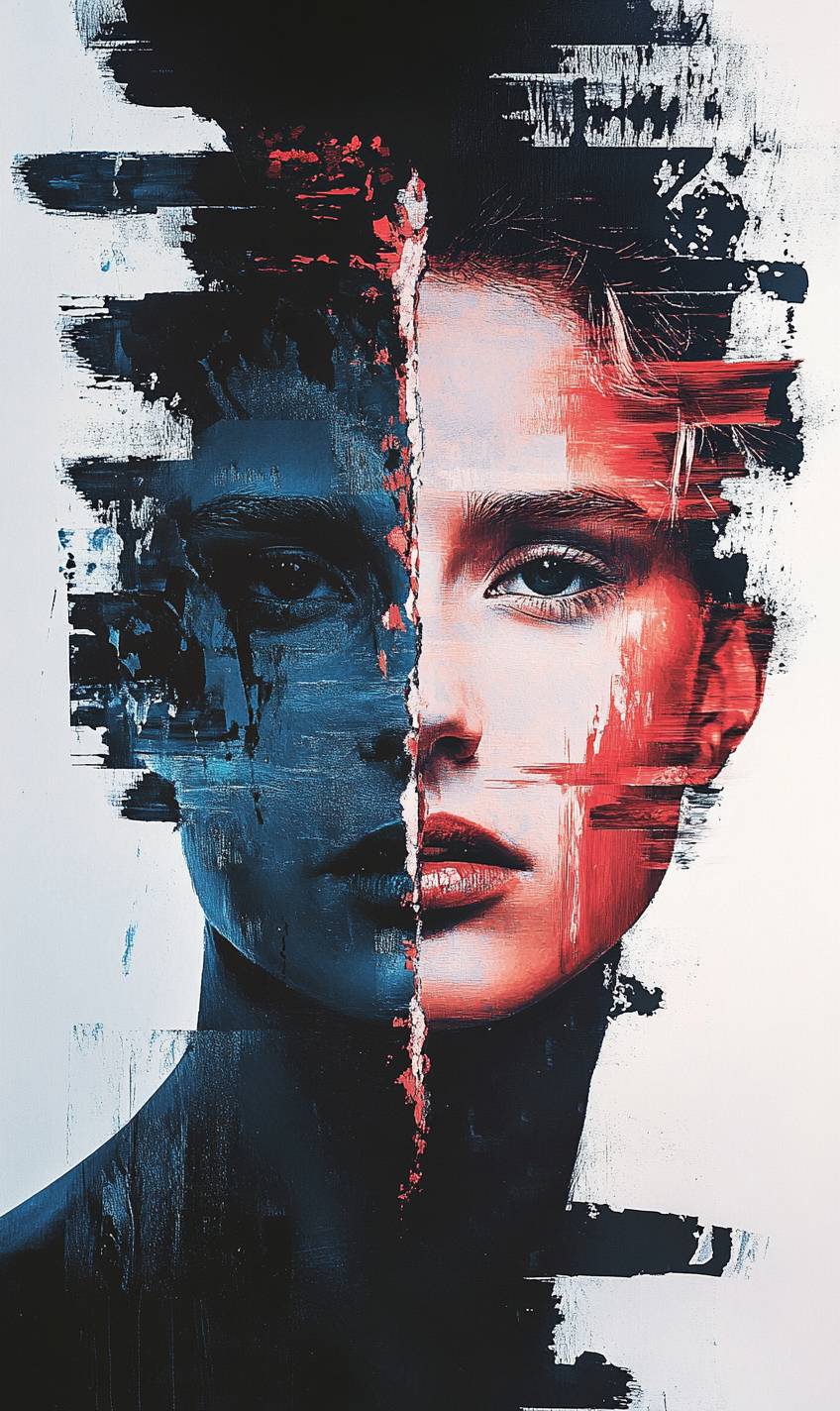 Surrealistic portrait with a split face, contrasting color halves, abstract brushstrokes, and emotional intensity.