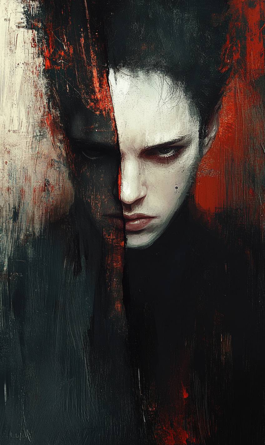 Surrealistic portrait, split face, contrasting color halves, abstract brushstrokes, geometric fragmentation, blending realism with abstraction, emotional intensity, dark tones