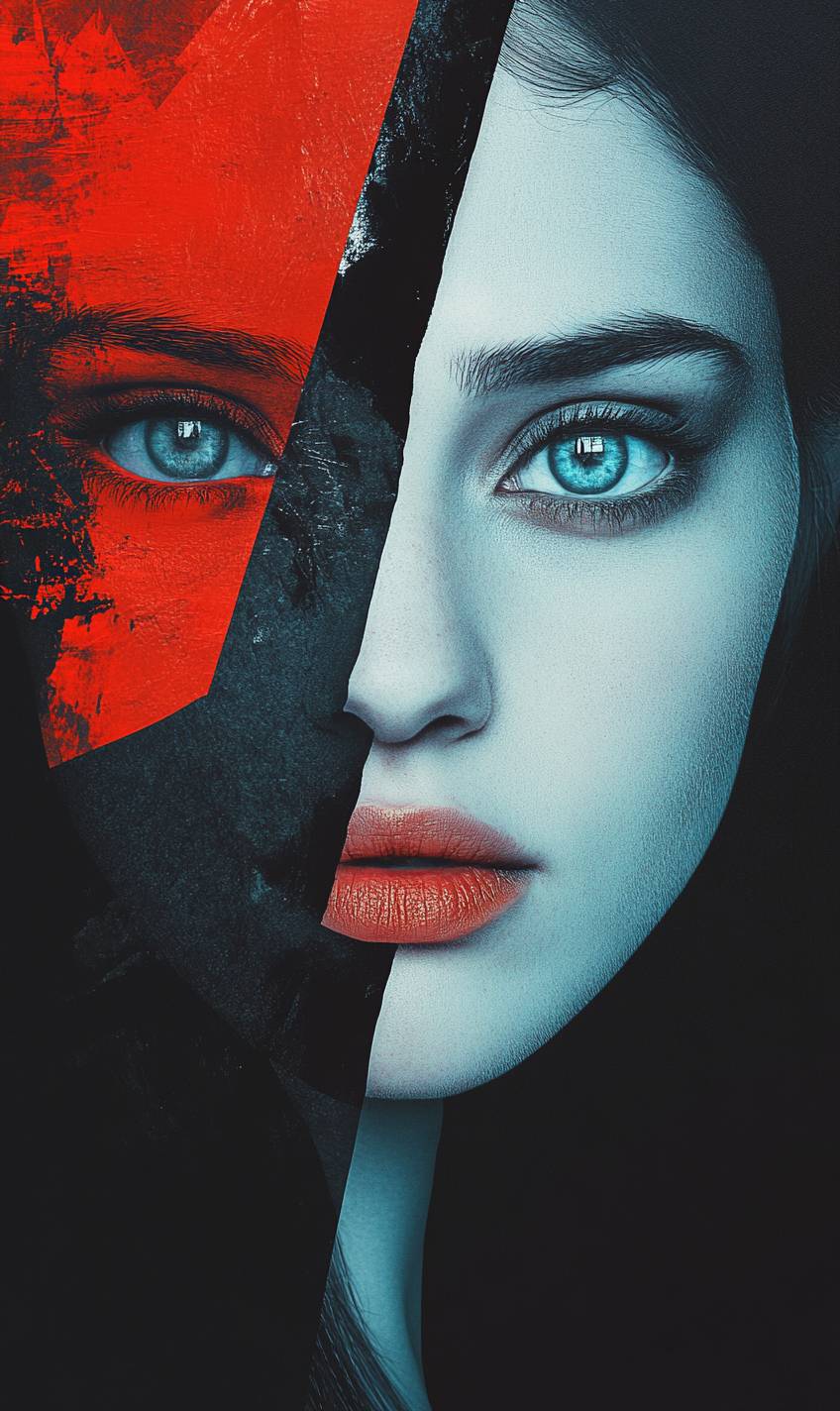 Surrealistic portrait, split face, contrasting color halves, abstract brushstrokes, geometric fragmentation, blending realism with abstraction, emotional intensity, dark tones --v 6.1 --ar 3:5