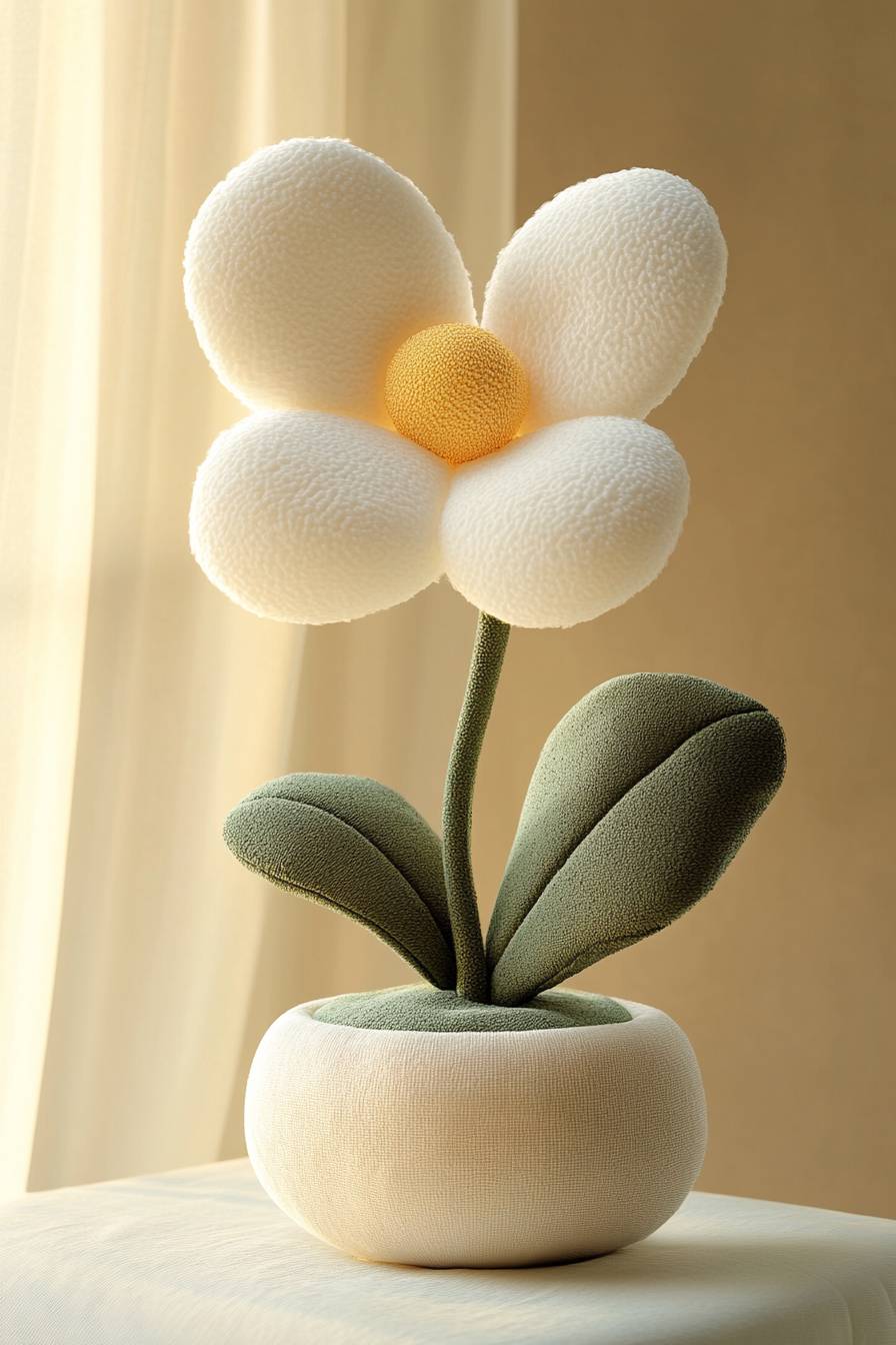 A minimalist Chi Bi style Chinese orchid bonsai, made from plush materials, focuses on simplicity and a cute aesthetic. The orchid petals are crafted from white or soft pink short plush, shaped in the traditional Chinese orchid form, featuring a round and slightly exaggerated plump appearance. Each petal has gentle curves, giving it a charming and compact look. At the center of the flower is a small golden-yellow plush dot, adding a simple yet adorable focal point. The leaves are short and round, made from soft green plush, symmetrically arranged and filled to enhance their gentle volume, reminiscent of the elegant simplicity of Chinese orchids, with a playful cartoon style. The stem is wrapped in deep green plush fabric, slightly curved to add depth without complexity. The pot is a round beige plush container with a smooth surface, designed to be minimalist, possibly featuring a single embroidered Chinese cloud pattern to hint at traditional style. The background is a simple, soft gradient with warm lighting, enhancing the comfortable, playful appearance, highlighting the plush texture while maintaining a clean and minimalist aesthetic.