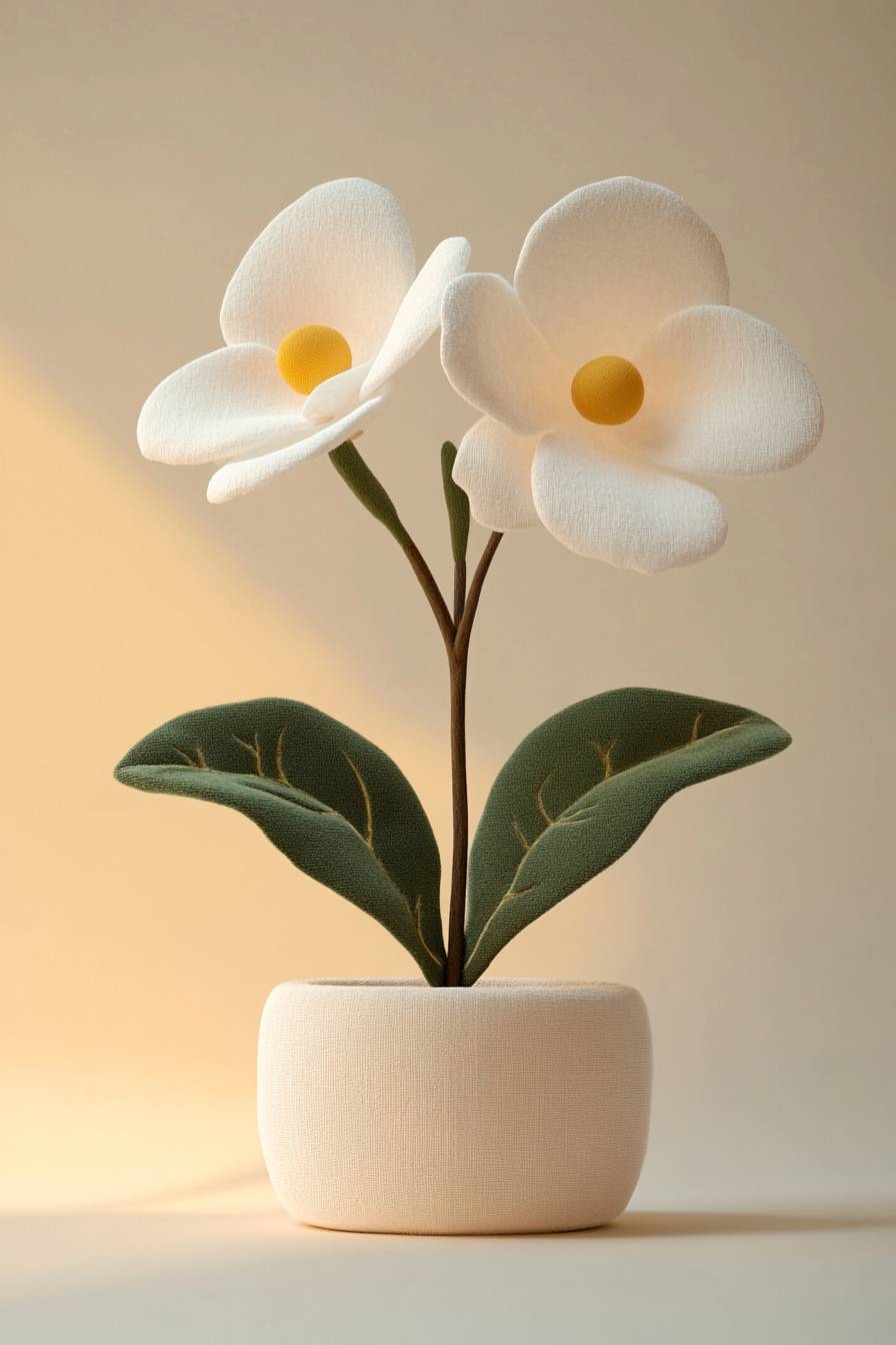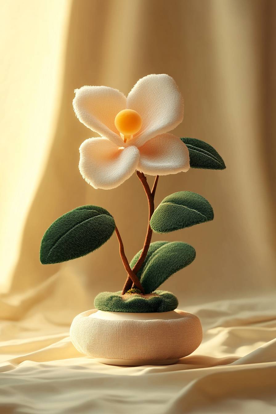 A minimalist Chi Bi style Chinese orchid bonsai made from plush materials, showcasing a cute aesthetic with simple designs.