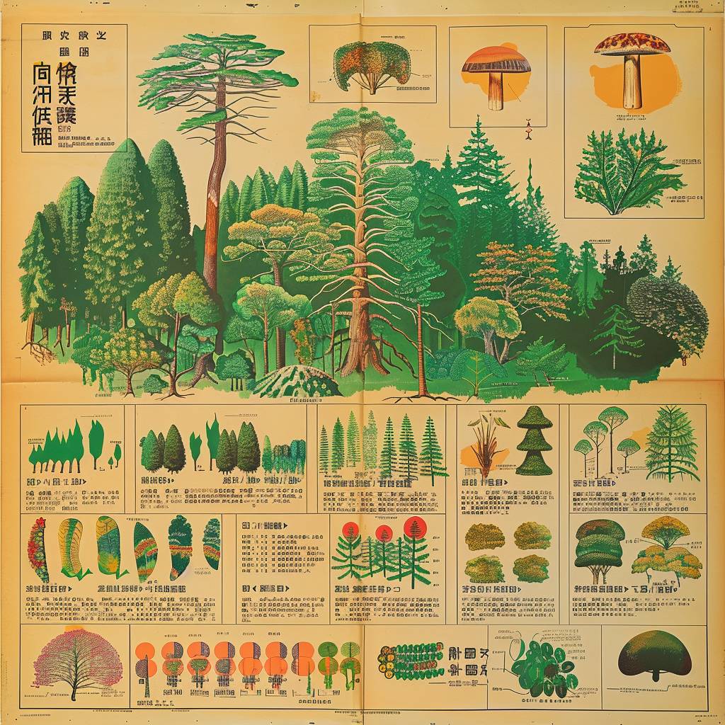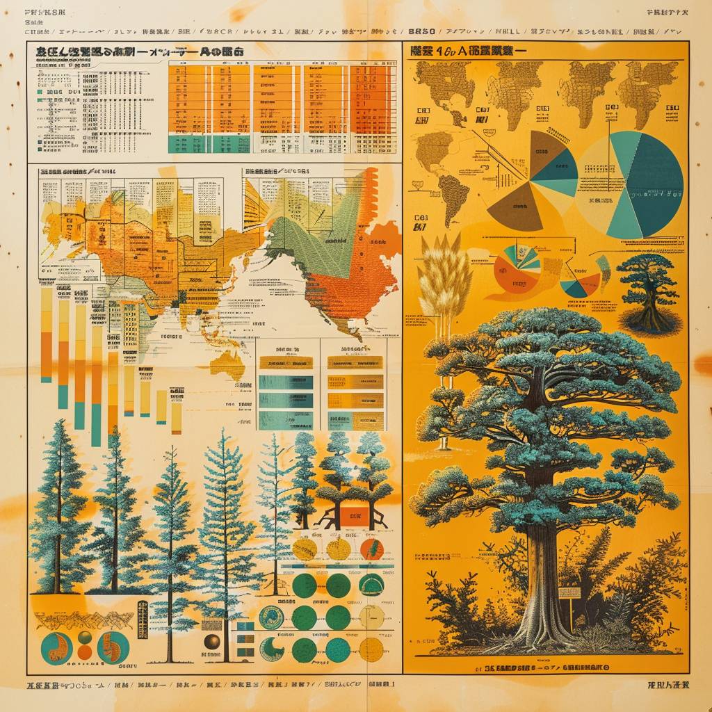 1970s Japanese infographic poster design depicting complex reforestation data.
