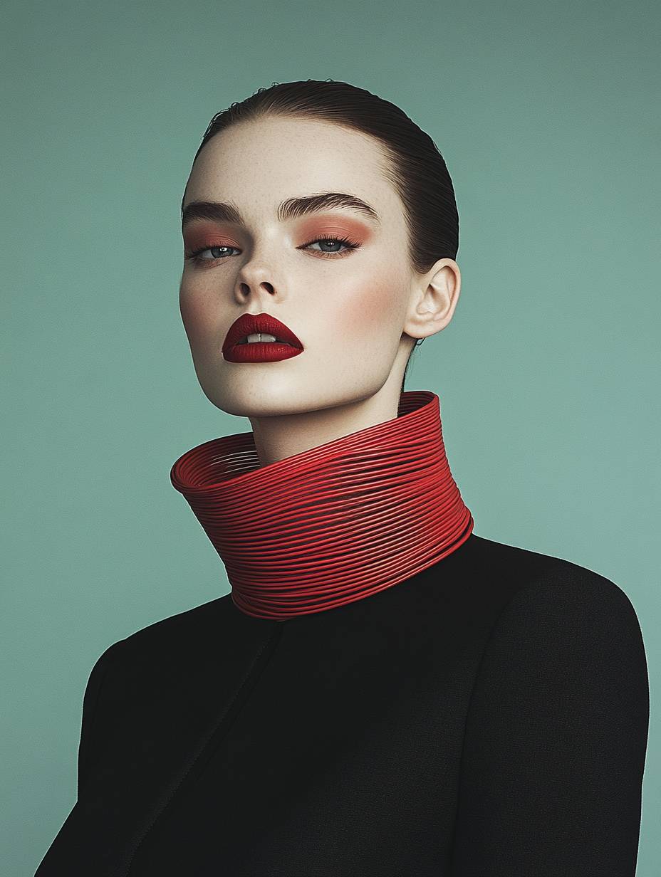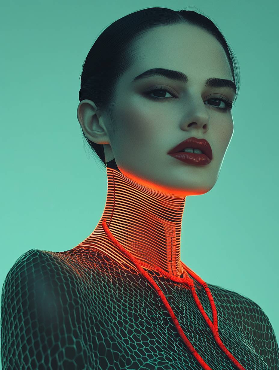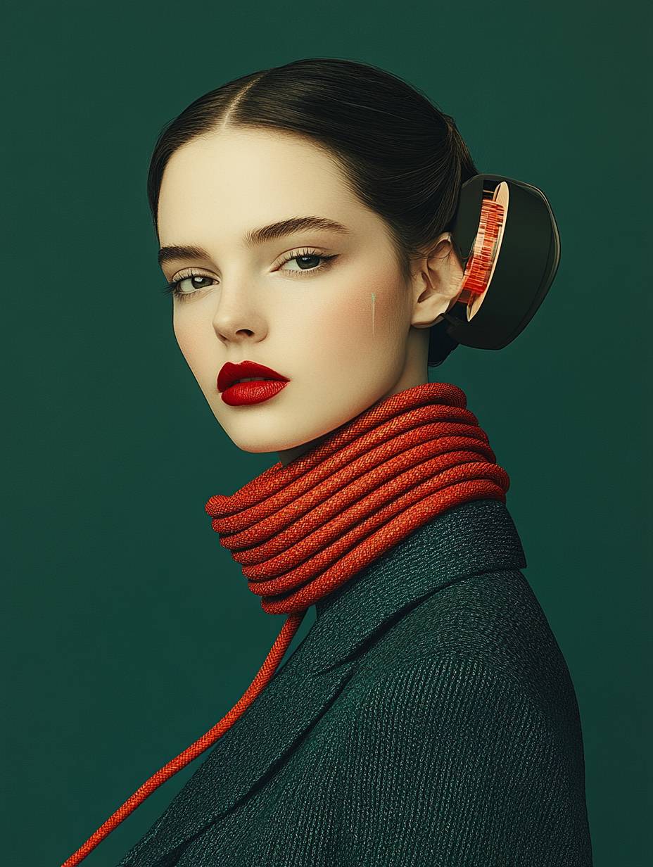 A fashion portrait of a cyborg woman with brunette hair, dark eyes, and red lips, wearing subtle technology with a red snake around her neck.