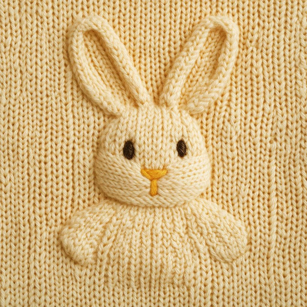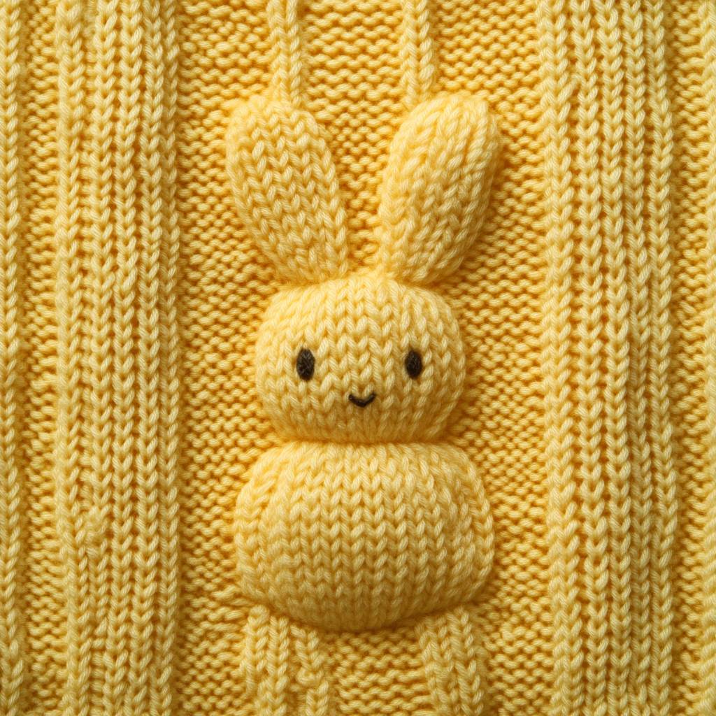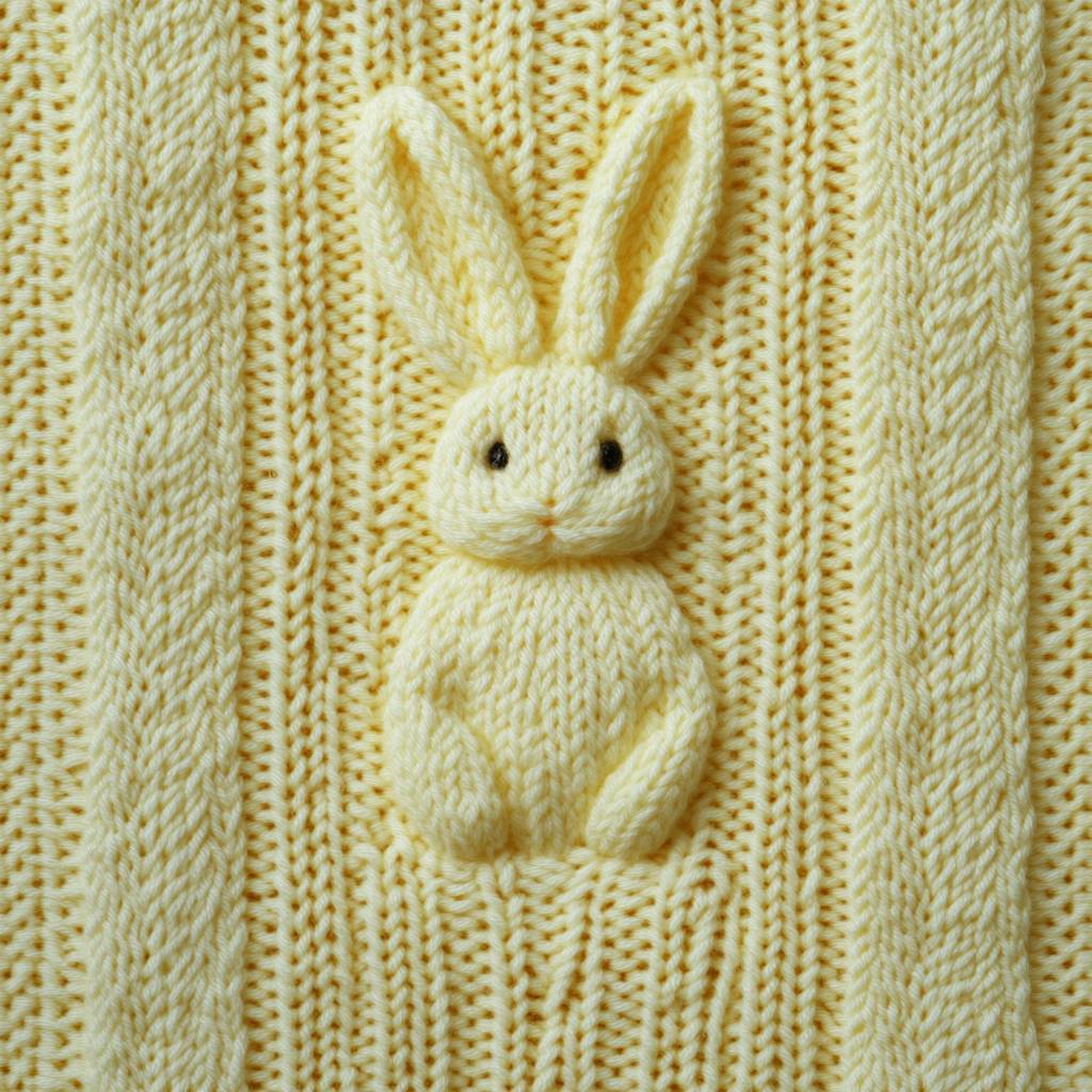 A creamy yellow sweater with an Easter bunny motif and beautiful, clear knitting stitches.