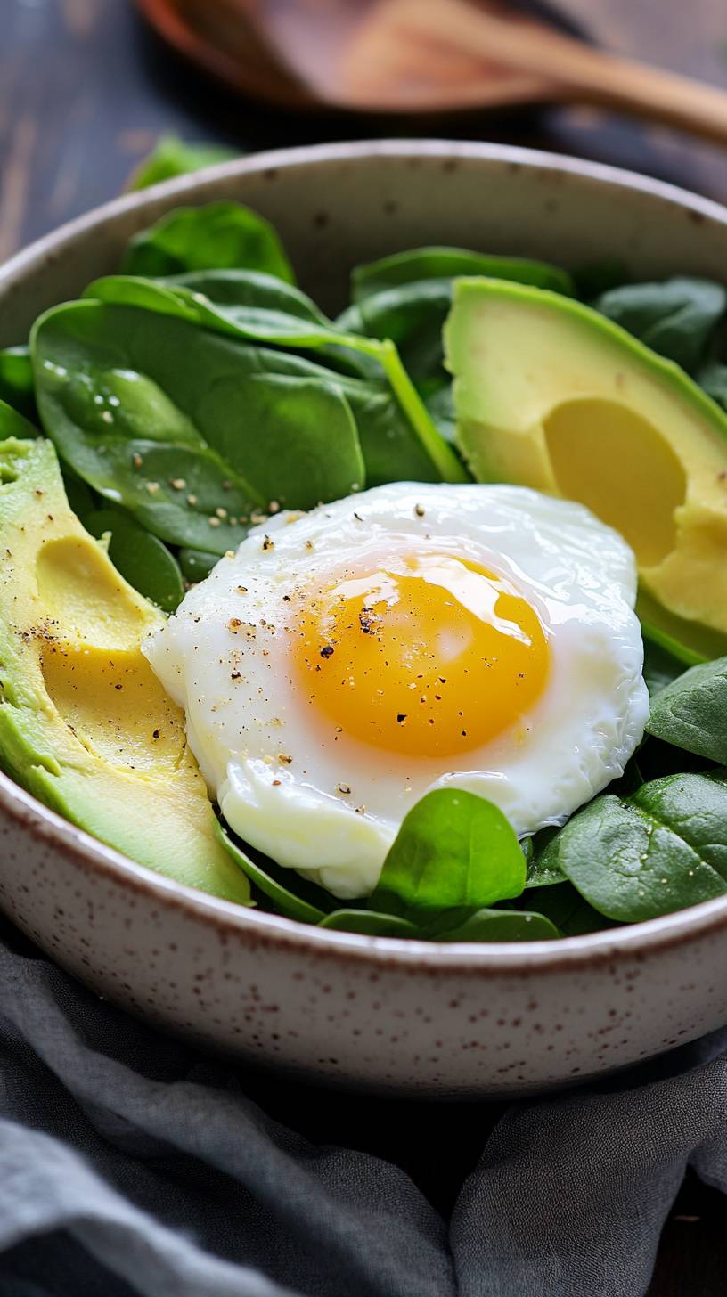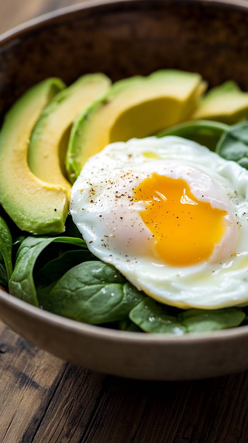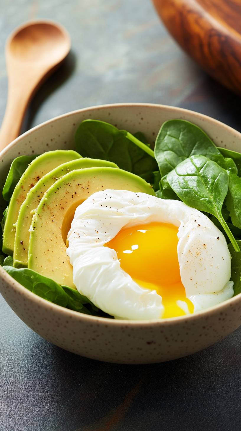 A rustic breakfast bowl with creamy avocado slices, a perfectly poached egg, and vibrant spinach leaves.