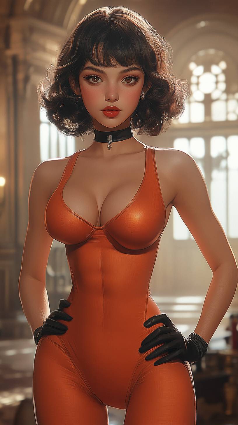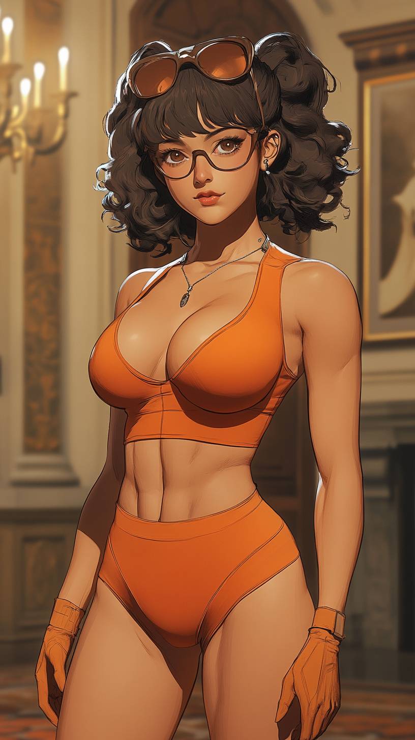 A detailed digital painting of a muscular Velma Dinkley in a skin-tight bodysuit exuding confidence and strength.