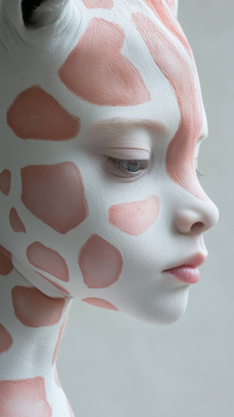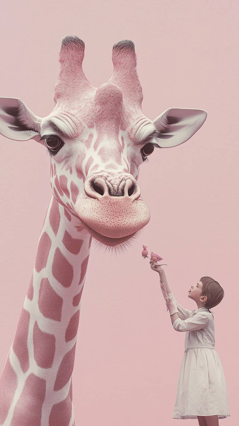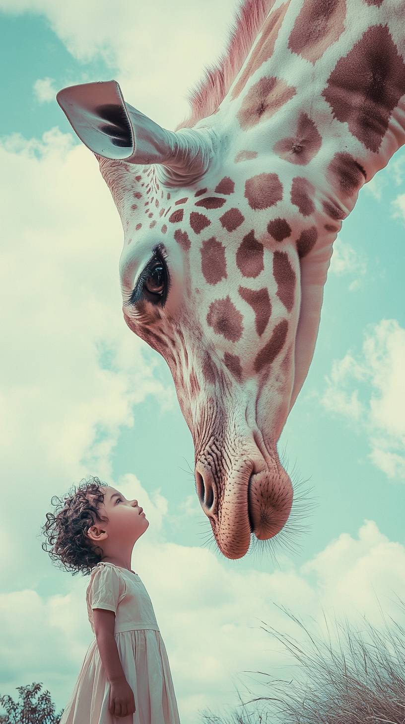 Salvador Dali style portrait of a child, giant giraffe with pink and white skin, light pastel tones, surrealism, in miami, salvador dali style imagery, low contrast, aaron brimhall palette, shot on leica, photorealistic, moody --ar 9:16 --v 6.1