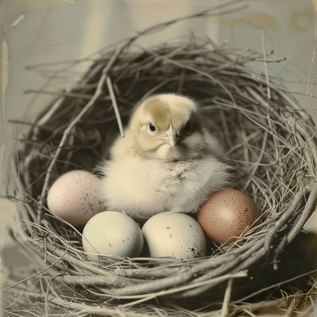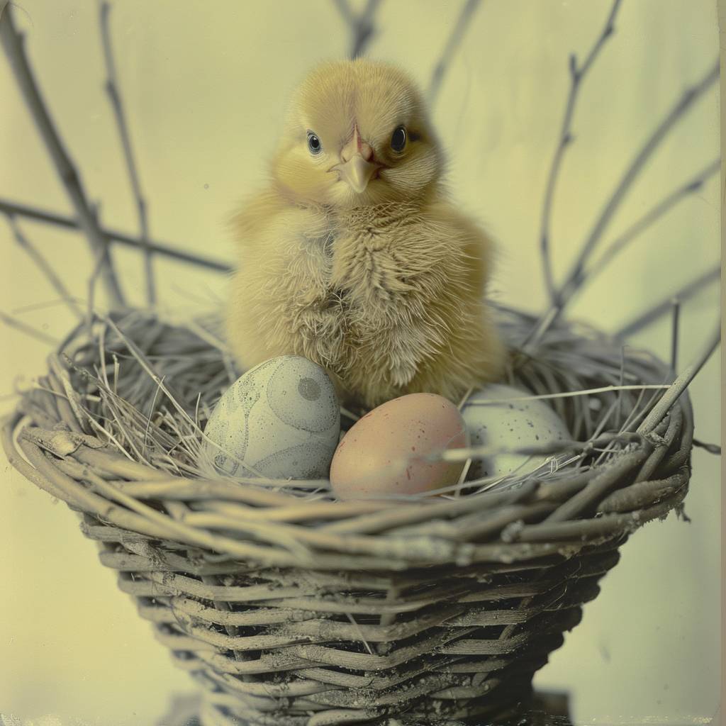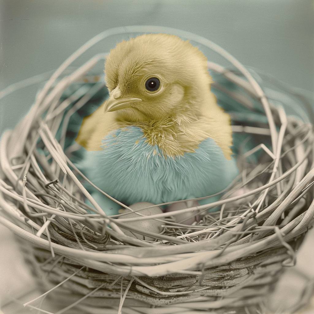 A hand-colored photograph in duotone showcasing a cute nestling in an egg basket.